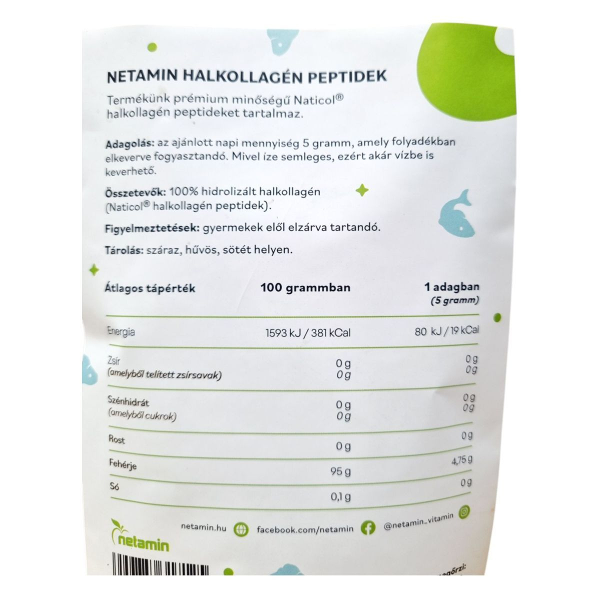 A Netamin Halkollagén Peptidek prémium minőségű Naticol halkollagén peptideket tartalmaz, amelyek semleges ízük miatt könnyen beilleszthetők a napi étrendbe. Az ajánlott napi mennyiség 5 gramm, amely folyadékban elkeverve fogyasztandó. A termék 100% hidrolizált halkollagént tartalmaz, és fontos, hogy gyermekek elől elzárva tartsuk. Tárolása száraz, hűvös, sötét helyen javasolt. Az energia- és tápérték adatok alapján a termék magas fehérjetartalommal rendelkezik, miközben zsír- és szénhidráttartalma elhanyagolható.