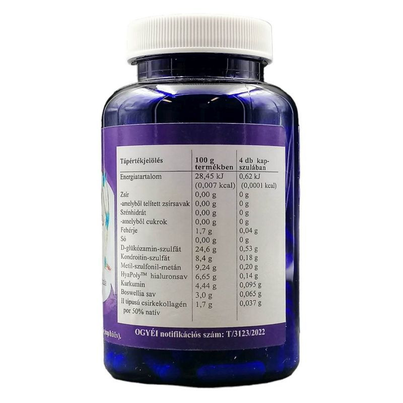 D-glükózamin-szulfát, zselatin, kondroitin-szulfát, metil-szulfonil-metán, mikrokristályos cellulóz, HyaPol™ nátrium-hialuronát, kurkuma-kivonat (Curcuma longa), indiai tömjénfa-kivonat (Boswellia serrata), zsírsavak magnézium-sói, szilícium-dioxid, II típusú csirkekollagén por