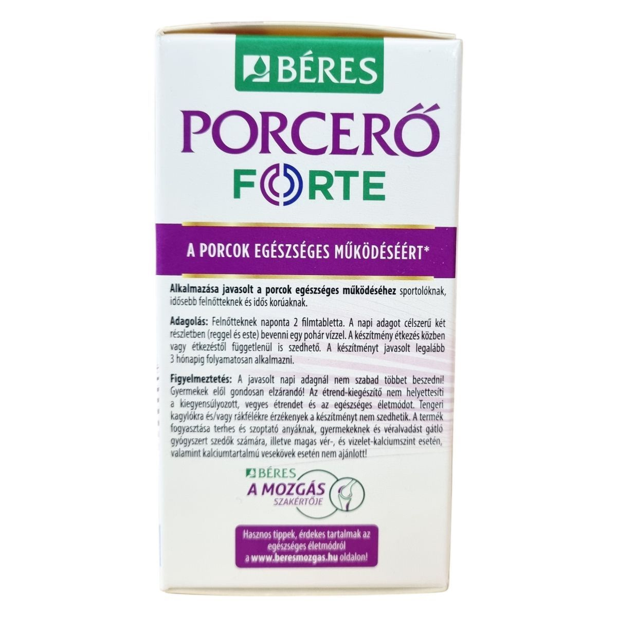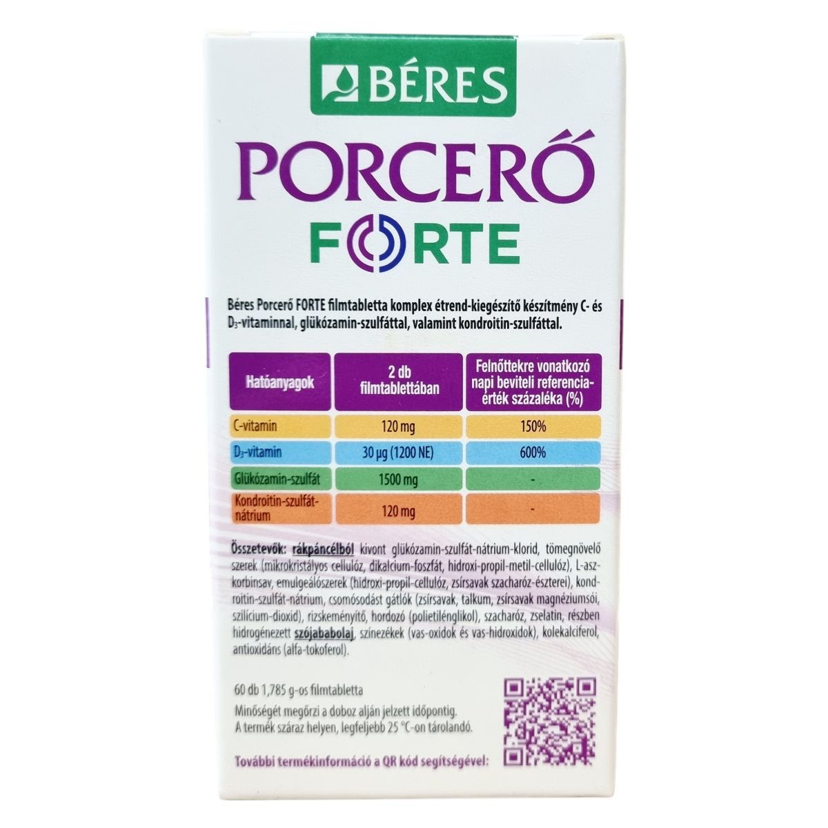 A Béres Porcerő FORTE egy komplex étrend-kiegészítő, amely C- és D3-vitamint, valamint a porcok természetes alkotórészeit, glükózamin-szulfátot és kondroitin-szulfátot tartalmaz. A C-vitamin hozzájárulhat a megfelelő kollagénképződéshez, ezáltal támogatva a porcok megfelelő működését. A D3-vitamin elősegítheti az egészséges csontozat fenntartását, valamint a kalcium és foszfor normál felszívódását és hasznosulását, továbbá támogathatja az egészséges izomfunkció fenntartását. A glükózamin-szulfát és kondroitin-szulfát a porcszövet természetes alkotórészei. A termék használata különösen ajánlott sportolóknak, idősebb felnőtteknek és idős korúaknak a porcok egészséges működésének támogatására. A készítményt célszerű legalább 3 hónapig folyamatosan alkalmazni. A termék filmtabletta formában készül, egy doboz 60 darabot tartalmaz, amelynek tömege 1,785 g/tabletta. A készítmény nem alkalmas tengeri kagylókra vagy rákfélékre érzékenyek számára, illetve bizonyos egészségügyi állapotok esetén nem ajánlott a szedése.