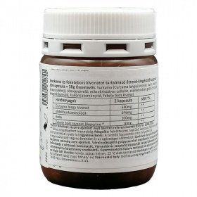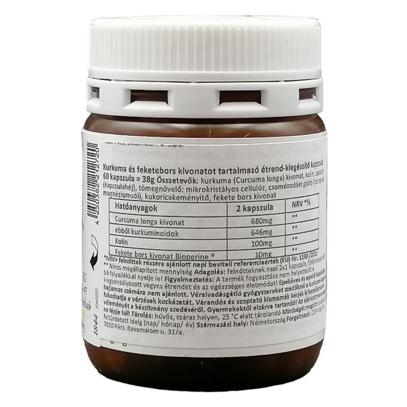A nyugati orvostudomány csak nemrég fedezte fel ezt a sokoldalú növényt, hatásaival kapcsolatban egyre több kutatás folyik, melyek közül sok hoz biztató eredményt még súlyos betegségekkel kapcsolatban is. A kurkuma hatásai: hatékonygyulladáscsökkentő, különösen a következő betegségek esetében: ízületi gyulladás (arthritis), csontízületi gyulladás (osteoarthritis), reumás jellegű ízületi gyulladás (rheumatoid arthritis), heveny fertőzések.Eredményesen kezeli a lábfej, a boka, a térd, a csípő, a derék, a hát, a csukló, a könyök és a váll ízületi megbetegedéseit. Fájdalomcsökkentő. Erős antioxidáns, leköti az egészséget károsító szabadgyököket. Csökkenti a cigaretta, az alkohol, a környezeti ártalmak és a vegyi anyagok káros hatásait. Javítja a vérkeringést, gátolja a vérrögök kialakulását, ezáltalcsökkenti az infarktus- és trombózisveszélyt, védi az érrendszert. Májvédő és epevédő hatással rendelkezik. Vízhajtó, támogatja a vesék munkáját. Serkenti a zsíranyagcserét, segít megőrizni az ideális testsúlyt. Összetevők 2 kapszulában: Curcuma longa kivonat 680mg, ebből kurkumionidok 646mg, kolin 100mg, fekete bors kivonat Bioperine 10mg.