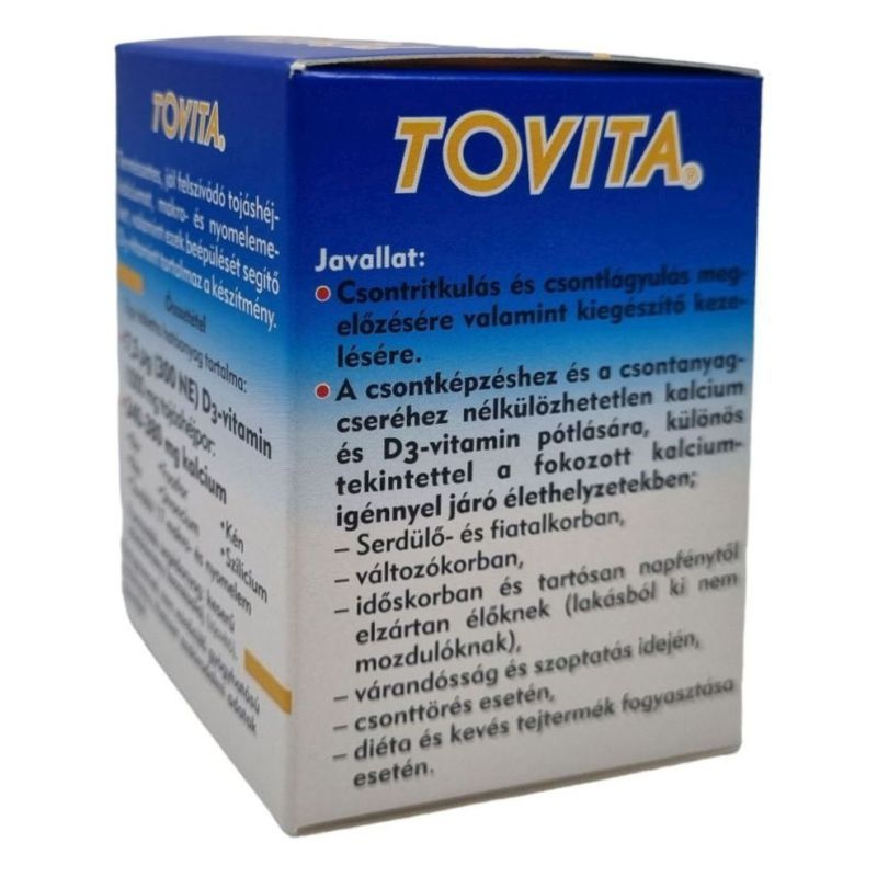 A csonttömeg megőrzése szempontjából kritikus élethelyzetekben - terhesség, szoptatás, változókor, rendszeres sportolás, csonttörés, csontritkulás - különösen fontos a megnövelt mennyiségű kalcium fogyasztása. A tabletta szedése ellenjavallt vesekőképződés, veseelégtelenség, gyomorsavhiány, mellékpajzsmirigy túlműködés, D-vitamin túladagolás esetén. A Tovita csonterősítő tabletta tojáshéjból készül. Jól felszívódó formában tartalmazza az emberi szervezet számára szükséges életfontosságú ásványi anyagokat.