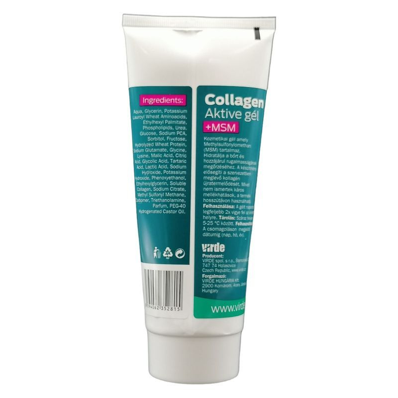 Collagen Aktive gél összetevői: Aqua, metil-szulfonil-, glicerin, Carbomer-amin, Parfum, PEG-40 hidrogénezett ricinusolaj, Methylchloroisothiazolinone, Methylisothiazolinone, benzil-alkohol.