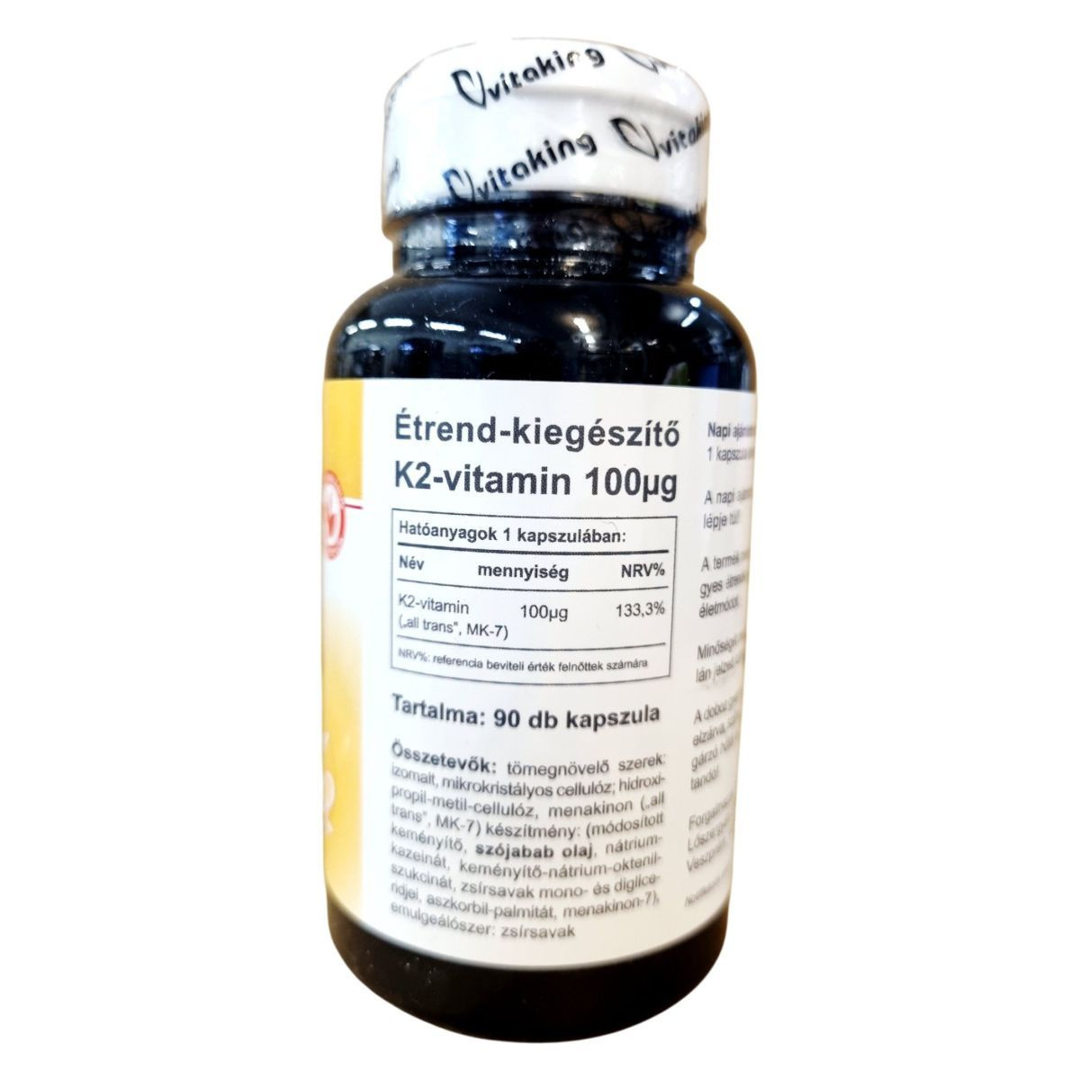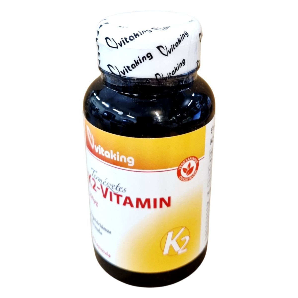 A Vitaking K2-vitamin étrend-kiegészítő 100µg K2-vitamint tartalmaz kapszulánként, amely az „all trans” MK-7 formában van jelen. A termék vegetáriánus formula, amely 90 kapszulát tartalmaz. A K2-vitamin hozzájárulhat a csontok és az érrendszer egészségének támogatásához. Az összetevők között szerepelnek tömegnövelő szerek, mint az izomalt és a mikrokristályos cellulóz, valamint a menakinon-7. A termék forgalmazója a Vitaking Kft., és a notifikációs száma 33329/2023.