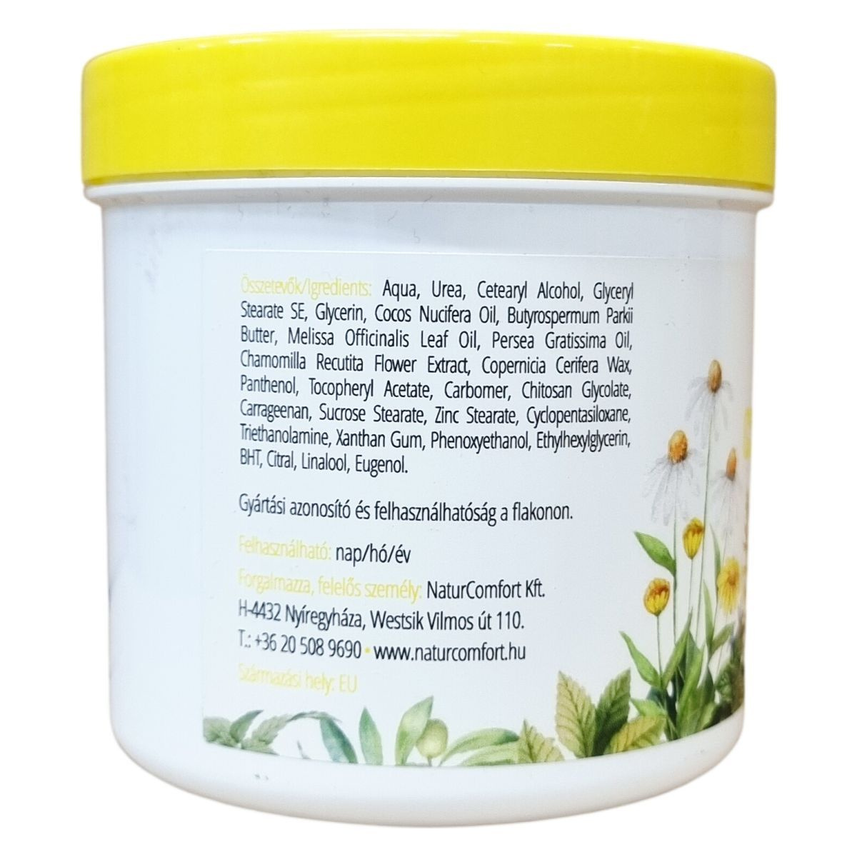 Ez a családi kézkrém különféle természetes és bőrápoló hatóanyagokat tartalmaz, például avokádóolajat, citromfű olajat, kókuszolajat, shea vajat, kékkamilla olajat és karnauba viaszt, amelyek együtt ápolják és védik a bőrt. A krém használata ajánlott naponta többször, különösen kézmosás vagy különféle munkafolyamatok, mint olajos, mosószeres vagy földes munkák előtt. A termék 250 ml-es kiszerelésű, gyártási azonosítóval ellátott, az összetevők listája a dobozon megtalálható. A krém Európai Unióban készült, a felelős forgalmazó a NaturComfort Kft., székhelye Nyíregyházán található.