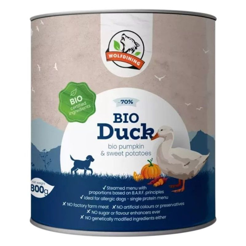 Teljes értékű párolt eledel felnőtt kutyáknak. 69% bio kacsahús bio sütőtökkel és bio édesburgonyával gazdagítva. A BARF étrend alapelvei szerint készült.