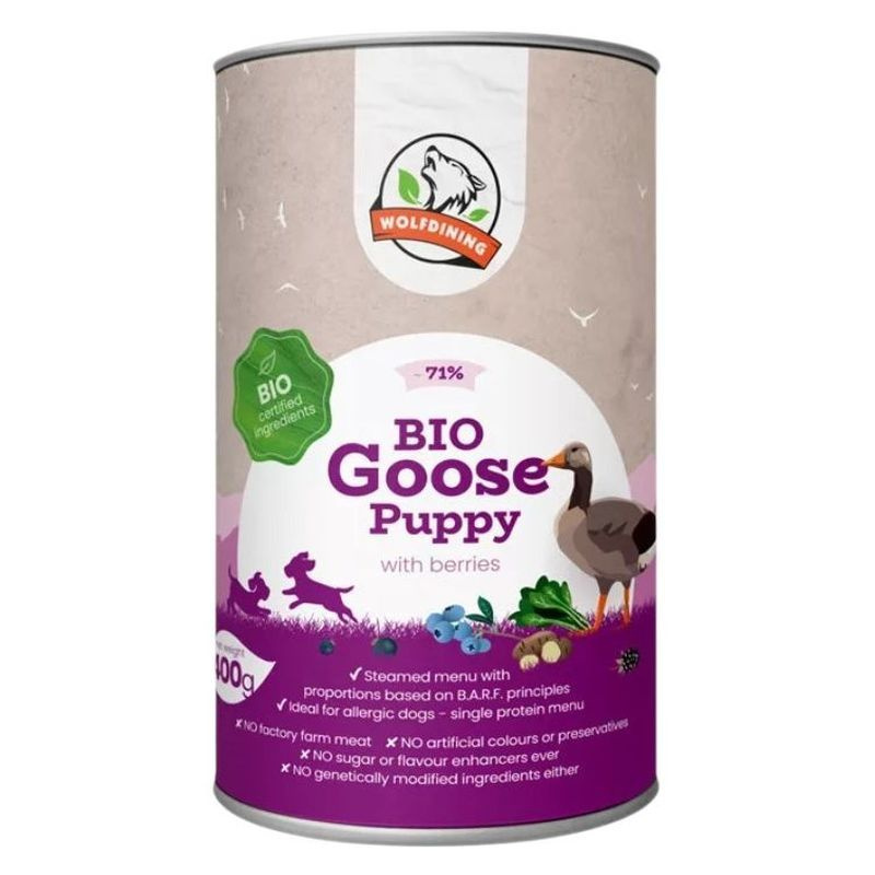 Teljes értékű párolt eledel kölyökkutyáknak. 71% bio libahús bio bogyós gyümölcsökkel gazdagítva a BARF étrend alapelvei szerint készült.