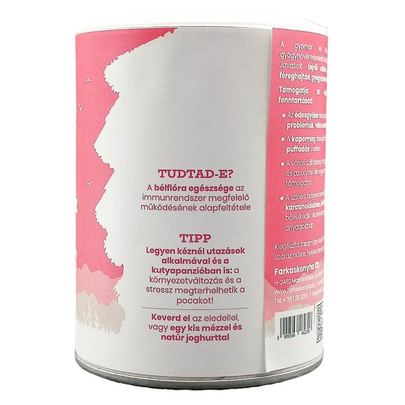 Érzékeny emésztésű kutyák számára kifejlesztett gyógynövénykeverék. Ajánlott étrendváltáskor, utazások alkalmával, gyógyszeres kezeléseket, féreghajtást követően, valamint stresszes élethelyzetekben és az érzékeny pocak támogatására a mindennapokban. Támogatja az egészséges bélflóra fenntartását: Az édesgyökér támogatólag hat gyomorsav problémák, reflux esetén. A kapormag elősegítheti az emésztést puffadás esetén. A vörös szilfakéreg, az egyiptomi útifű maghéj és az orvosi ziliz a gyomor és bélműködést támogatja. A színes, bogyós termésű homoktövis karotinoidokban, bioflavonoidokban gazdag, bővelkedik vitaminokban és ásványi anyagokban.Tudtad-e?