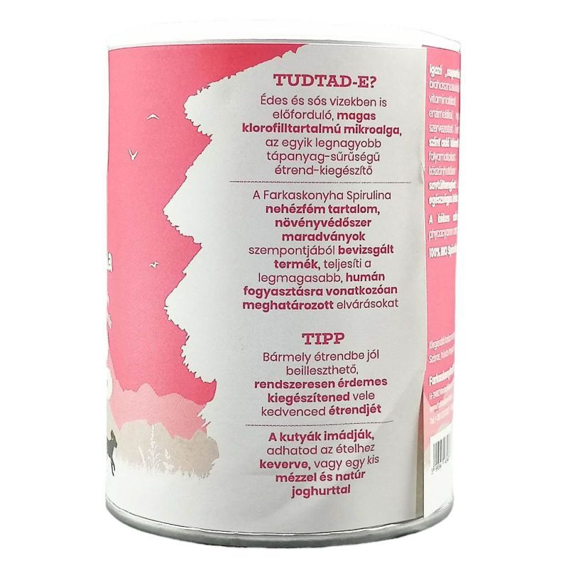 Édes és sós vizekben is előforduló, magas klorofilltartalmú mikroalga, az egyik legnagyobb tápanyag-sűrűségű étrend-kiegészítő. A Farkaskonyha Spirulina nehézfém tartalom, növényvédőszer maradványok szempontjából bevizsgált termék, teljesíti a legmagasabb, humán fogyasztásra vonatkozóan meghatározott elvárásokat is. Bármely étrendbe jól beilleszthető, rendszeresen érdemes kiegészítened vele kedvenced étrendjét.