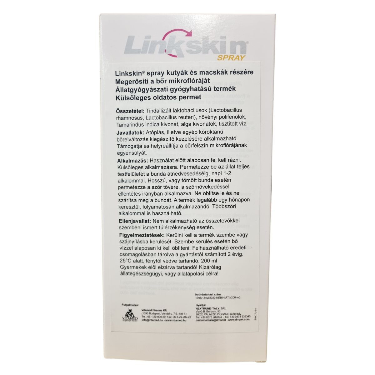 A Linkskin® spray kutyák és macskák, kölyök- és felnőtt állatok számára készült, bőrápoló és mikrobiom-erősítő készítmény. Segíti az atópiás és egyéb bőrproblémák kiegészítő kezelését azáltal, hogy normálissá teszi a bőrfelszín mikrobiológiai összetételét. A termékben található tindalizált Lactobacillus rhamnosus és Lactobacillus reuteri baktériumok, valamint növényi polifenolok és természetes kivonatok támogatják a bőr egészségét és egyensúlyát. A spray használata egyszerű, és a bőr vagy a szőr alapos nedvesítésével fejti ki hatását. Az olasz NEXTMUNE ITALY gyártja, amely az állatgyógyászati termékek fejlesztésére szakosodott, és a termék az Európai Unióban készült. A forgalmazó a Vitamed Pharma Kft., amely biztosítja a magyarországi elérhetőséget és ügyfélszolgálatot.