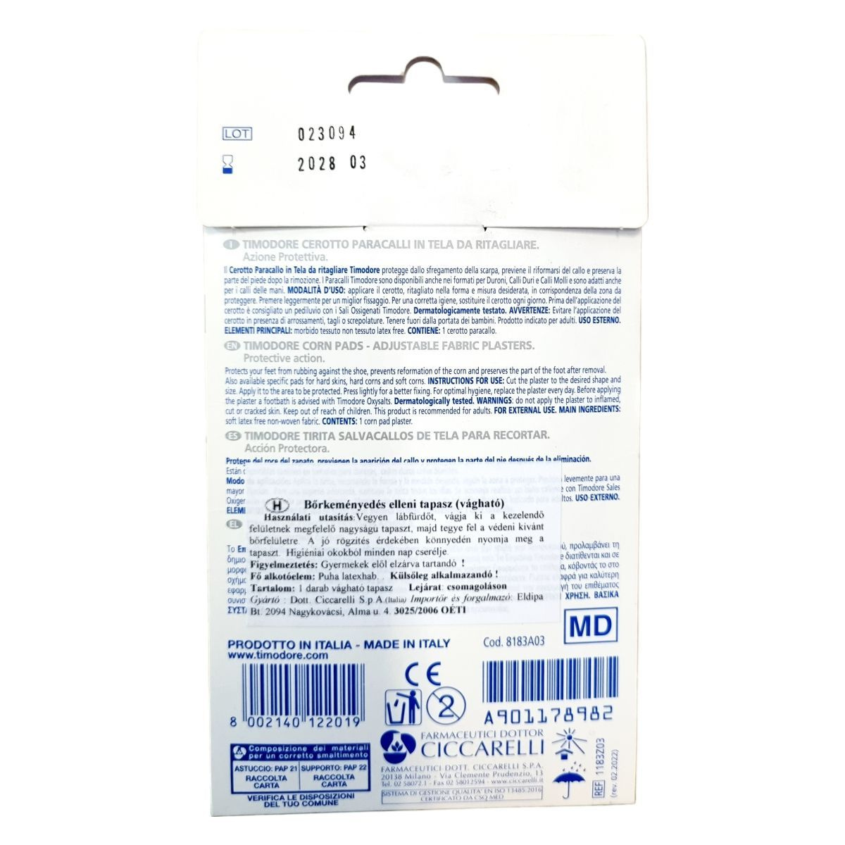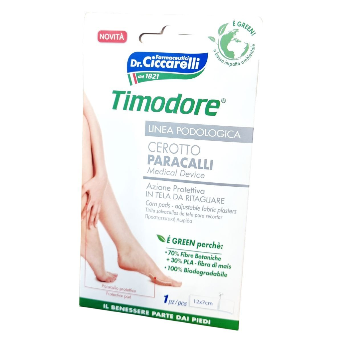 A Dr.Ciccarelli Timodore Cerotto Paracalli egy orvostechnikai eszköz, amely védelmet nyújt a bőrkeményedések ellen. A tapasz vágható, így a kívánt méretre és formára alakítható, hogy pontosan illeszkedjen a védeni kívánt területre. A termék 70% növényi rostot és 30% PLA-t tartalmaz, amely kukoricából származó rost, és teljesen biológiailag lebomló. A tapasz latexmentes, így érzékeny bőrűek is használhatják. A termék dermatológiailag tesztelt, és a gyártó javasolja, hogy alkalmazás előtt lábfürdőt vegyenek Timodore Sali Ossidanti használatával. A tapaszt naponta cserélni kell a higiénia fenntartása érdekében. A termék kizárólag felnőttek számára készült, és külső használatra ajánlott.