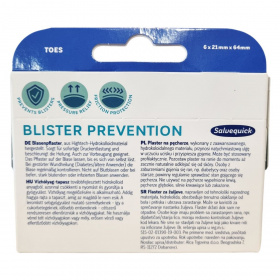 A Salvequick® Blister Prevention tapasz fejlett hidrokolloid anyagból készült, amely azonnali nyomáscsökkentést nyújt és felgyorsítja a vízhólyagok gyógyulását. Kifejezetten a lábujjak vízhólyagjainak megelőzésére és kezelésére tervezték, mérete 6 x 21 mm x 64 mm. A tapasz hatását úgy fejti ki, hogy mérsékli a nyomást és védelmet nyújt a súrlódás ellen. Használati utasítás szerint a tapaszt a vízhólyagon kell tartani mindaddig, amíg az magától le nem esik. A termék használata során különösen figyelni kell a sérülések állapotára, különösen ha a sebgyógyulás lelassult vagy problémás, mint például cukorbetegség esetén. Nem alkalmazható olyan sebekre, amelyek véreznek vagy fertőzöttek. A csomag 6 darab tapaszt tartalmaz, amelyek megkönnyítik a kezelést és a megelőzést.