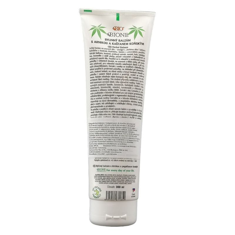 Összetétel/INCI: AQUA, GLYCERIN, METHYL SALICYLATE, ETHYLHEXYL STEARATE, MENTHOL, CAMPHOR, BUTYROSPERMUM PARKII BUTTER, AESCULUS HIPPOCASTANUM EXTRACT, EUCALYPTUS LEAFEXTRACT, PANTHENOL, ARNIKA MONTANA EXTRACT, ALLANTOIN, TOCOPHEROL, XANTHAM GUM, SODIUM HYDROXIDE, SODIUM HYALURONATE, CARBOMER, ACRYLATES/VINYL ISODECANOATECROSSPOLYMER, SYMPHYTUM OFFICINALE, ROOT EXTRACT, PARFUM, PHENOXYETHANOL, DIMETHYL SULPHONE, ROSMARINUS OFFICINALIS EXTRACT, BOSWELLIA SERRATA EXTRACT, CANNABIS SATIVA SEED OIL, ALCOHOL DENAT, CANNABIS SATIVA LEAF EXTRACT.