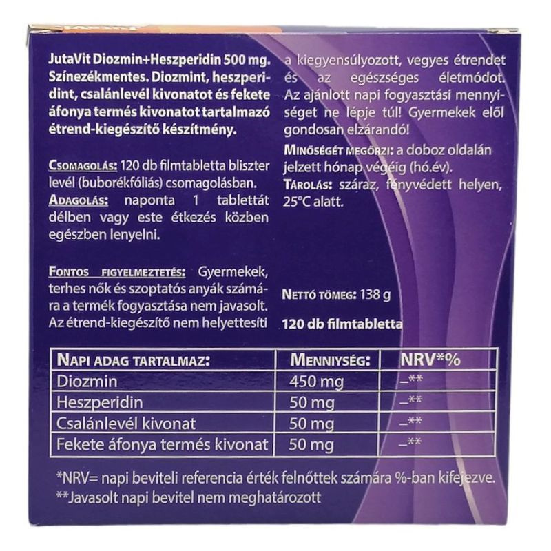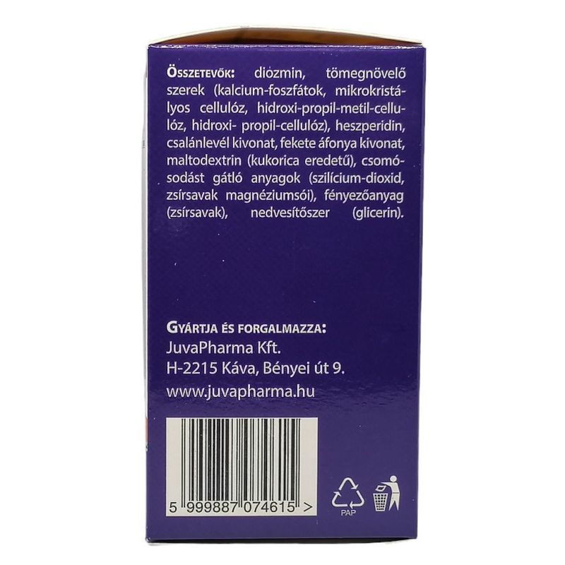 Adagolás: naponta 1 tablettát délben vagy este étkezés közben egészben lenyelni. Napi adag tartalmaz: Diozmin 450mg, Heszperidin 50mg, Csalánlevél kivonat 50mg, Fekete áfonya termés kivonat 50mg. Összetevők: diozmin, tömegnövelő szerek (dikalcium-foszfát, hidroxi-metil-cellulóz), heszperidin, csalálevél kivonat, fekete áfonya kivonat, csomósodást gátló (szilícium dioxid, magnézium-sztearát, talkum), fényező anyag (sztearin sav, kókusz olaj), színezékek (titán-dioxid, vörös vas oxid, sárga vas oxid), nedvesítőszer (polidextróz). Tárolás: Száraz, fényvédett helyen, 25C alatt. Fontos figyelmeztetés: A termék gyermekek kezelésére nem alkalmas. Terhesség és szoptatás alatt a termék fogyasztása nem javasolt. Az étrend-kiegészítő nem helyettesíti a kiegyensúlyozott, vegyes étrendet és az egészséges életmódot. Az ajánlott napi fogyasztási mennyiséget ne lépje túl! Gyermekek elől gondosan elzárva tartandó!