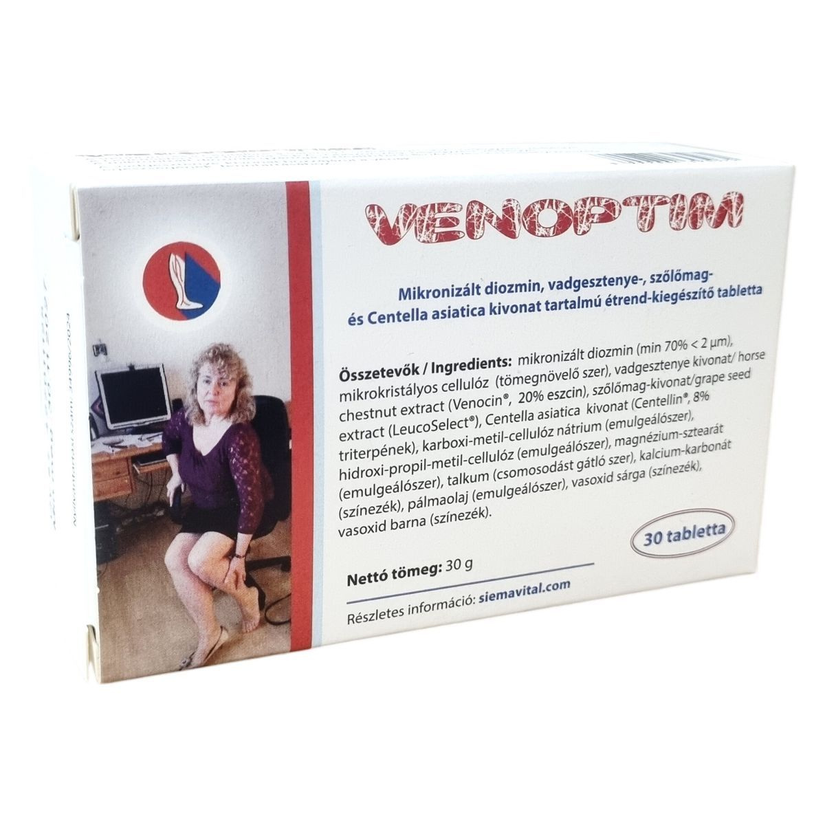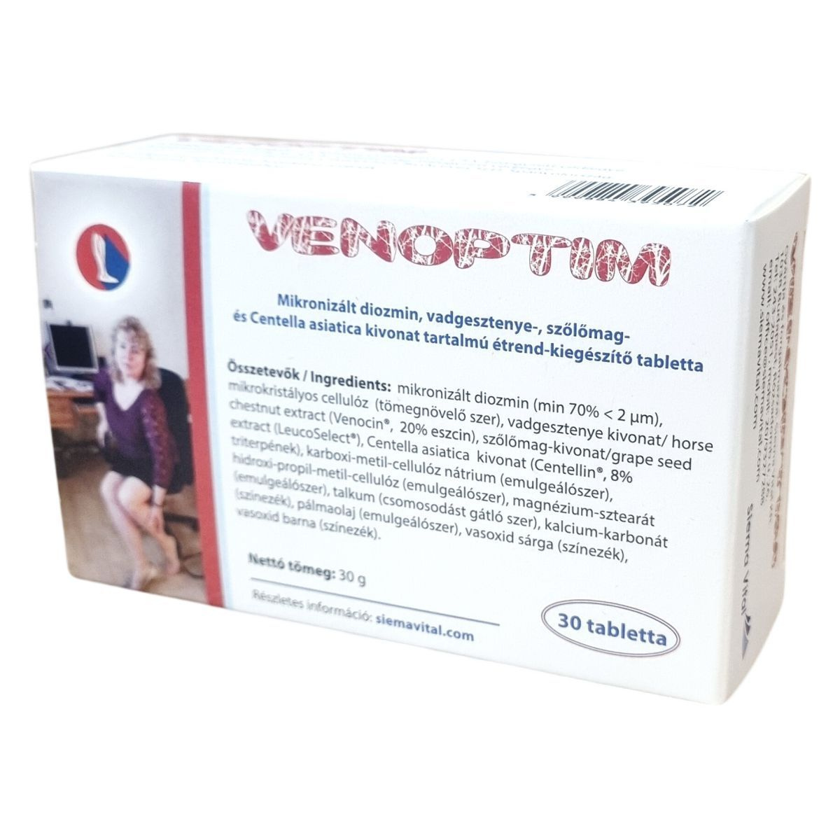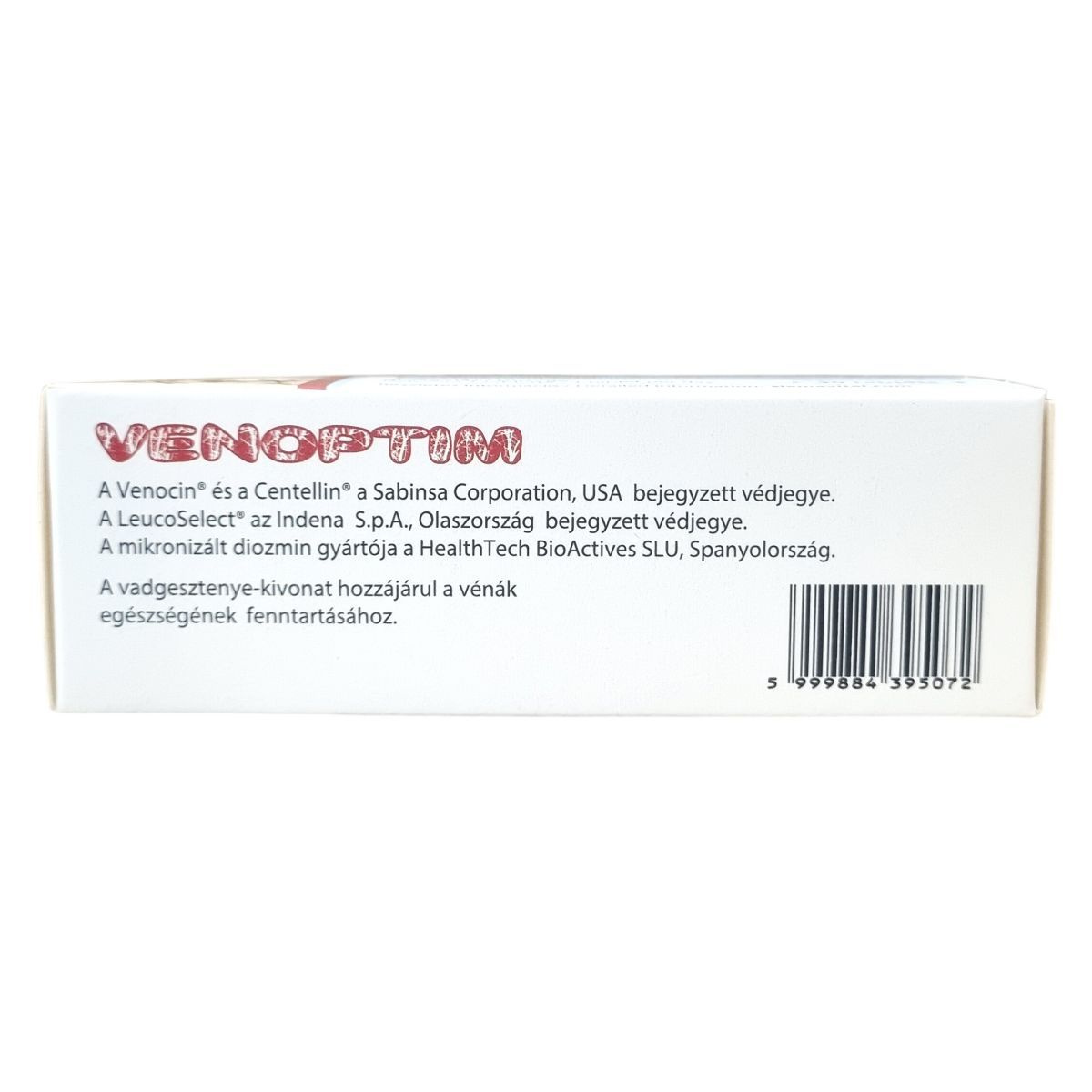 A Venoptim tabletta a Sabinsa Corporation, USA által bejegyzett Venocin® vadgesztenye-kivonatot, az Indena S.p.A., Olaszország által bejegyzett LeucoSelect® szőlőmag-kivonatot és a Centellin® Centella asiatica kivonatot tartalmazza, mely összetevők különleges minőségét biztosítják. A mikronizált diozmin (gyártója: HealthTech BioActives SLU, Spanyolország) alkotóeleme segítheti a vénák egészségének fenntartását. Egy tabletta 450 mg diozmin, 100 mg szőlőmag-kivonat, 100 mg vadgesztenye-kivonat (ebből 20 mg eszcin) és 60 mg Centella asiatica kivonatot (ebből 4,8 mg triterpének) tartalmaz. A termék 30 darab tablettát tartalmaz, melyek előállítása során több emulgeálószert és színezéket is felhasználnak. A készítmény használata a gyártói ajánlások szerint javasolt, naponta egy tabletta fogyasztásával. A termék célja az egészséges vénák támogatása, amely a vadgesztenye-kivonat hozzájárulásával lehetséges.
