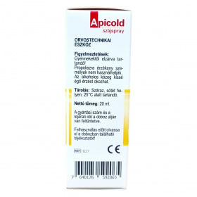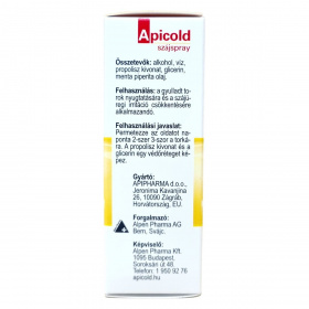 Az Apicold szájspray egy orvostechnikai eszköz, amely propolisz kivonatot és glicerin tartalmaz, melyek védőréteget képezhetnek a nyálkahártyán. A terméket gyártja az APIPHARMA d.o.o. Horvátországban, és forgalmazza az Alpen Pharma AG, valamint képviseli az Alpen Pharma Kft. Magyarországon. A propolisz kivonat miatt allergiás reakciók előfordulhatnak, ezért érzékenység esetén kerülendő a használata. Az alkoholos összetevő miatt a spray használata enyhe égő érzést válthat ki. A termék használata előtt javasolt elolvasni a dobozban található tájékoztatót. A gyártási szám és egyéb azonosítók a csomagoláson találhatók.