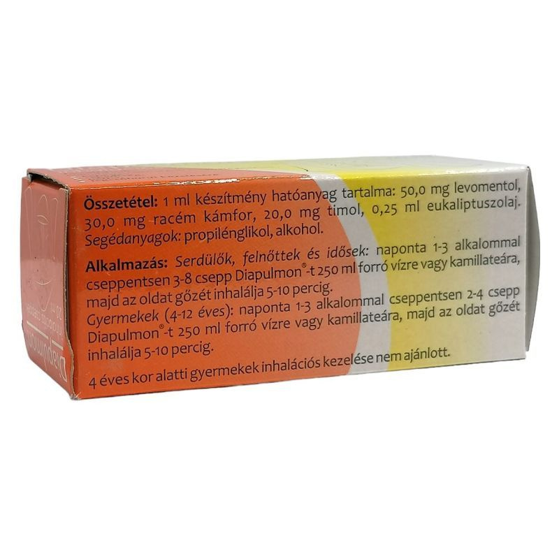 Hatóanyagai (illóolajok) szabaddá teszik a légutakat, fokozzák a nyálkahártyák véráramlását, könnyítik a légzést. Mikor ajánlott a készítmény alkalmazása? Különböző felső légúti megbetegedések köhögés, rekedtség, nátha, valamint légcsőhurut kezeléséreajánlott. Mikor nem szabad a készítményt alkalmazni? Ha a hatóanyagokkal vagy a segédanyagokkal szembeni egyéni túlérzékenység esetén a Diapulmon inhalációs cseppeket nem szabad alkalmaznia.