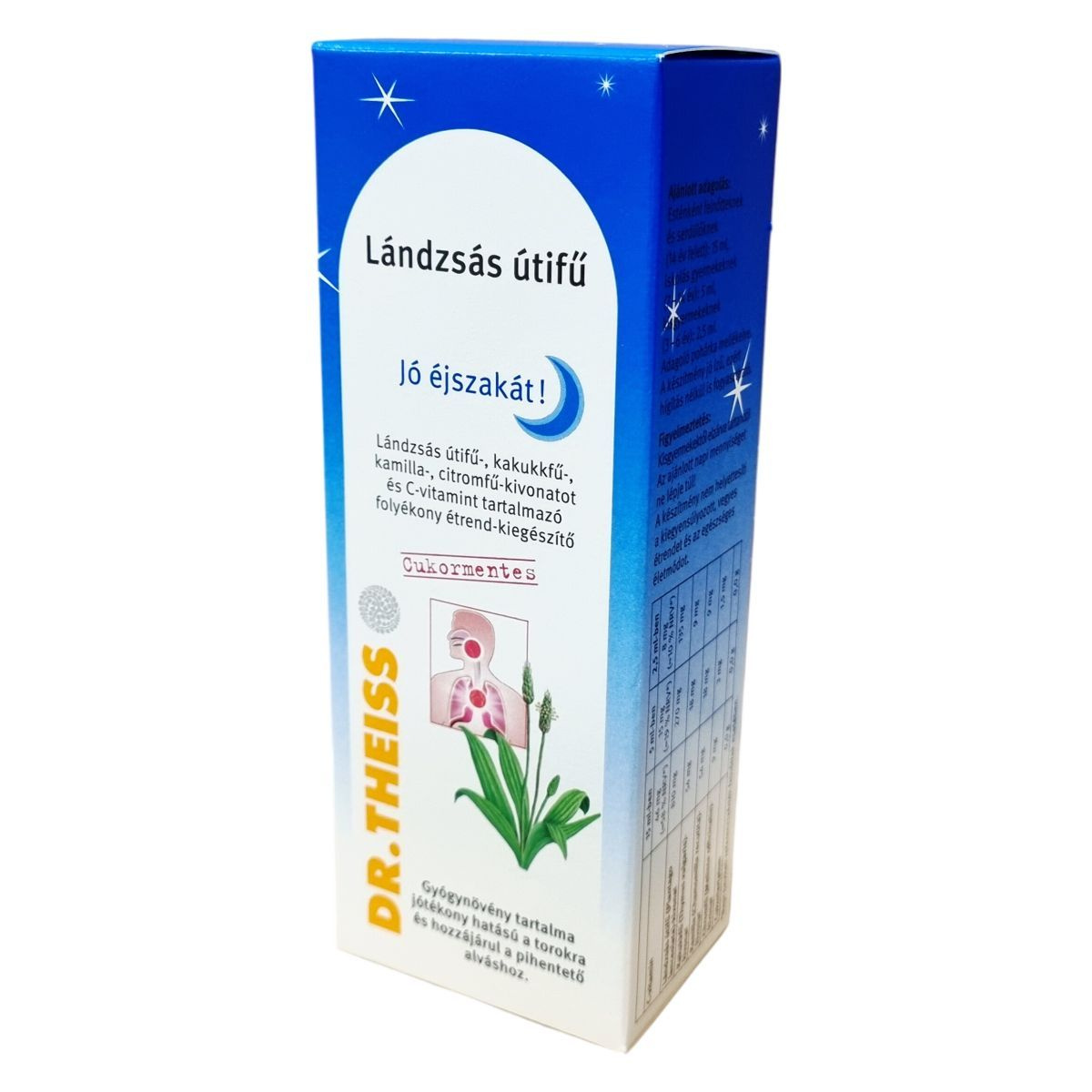 A Dr. Theiss Lándzsás útifű Jó éjszakát! folyékony étrend-kiegészítő lándzsás útifű-, kakukkfű-, kamilla-, citromfű-kivonatot és C-vitamint tartalmaz. A gyógynövénykivonatok jótékony hatásúak lehetnek a torokra, hozzájárulhatnak a pihentető alváshoz, valamint az őszi-téli meghűléses időszak kellemesebb átvészeléséhez. A lándzsás útifű-kivonat támogathatja a légúti rendszer egészségének megőrzését, míg a kamilla és citromfű elősegíthetik az éjszakai nyugalmat. A készítmény alkohol- és cukormentes, ezért cukorbetegek is fogyaszthatják. Jó ízű, így hígítás nélkül is fogyasztható, adagoló pohárka mellékelve. Túlzott fogyasztása hashajtó hatású lehet.