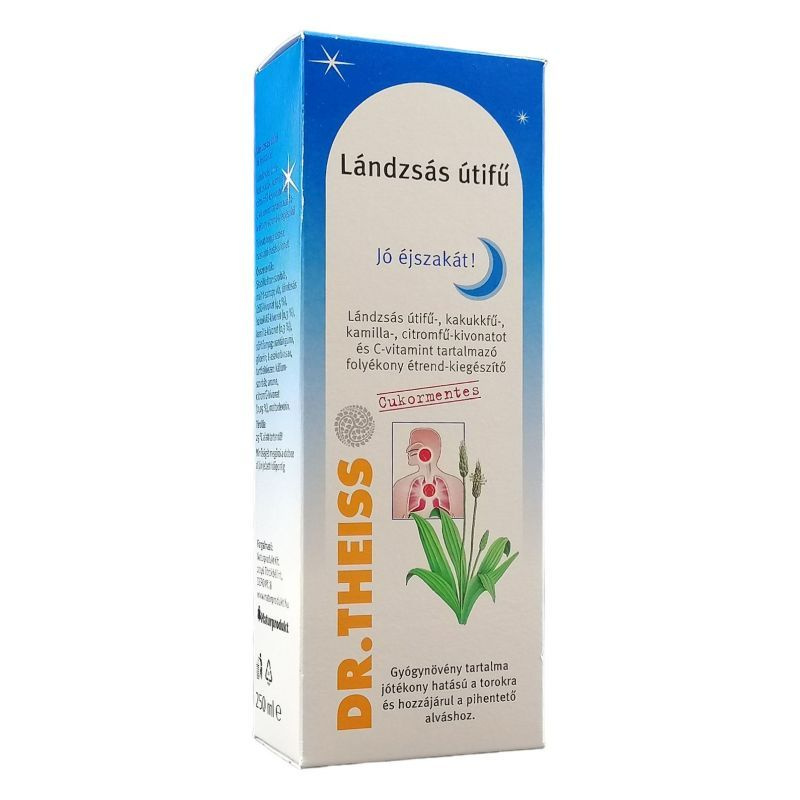 A Dr. Theiss-féle lándzsás útifűszirup "jó éjszakát" változata nem csak jóízű segítség a légutak egészségének megőrzésére az őszi-téli meghűléses időszakban, hanem egyéb gyógynövény-tartalma révén (kakukkfű, citromfű, kamilla) hozzájárul a pihentető alváshoz. Az étrend-kiegészítő használata kifejezetten este ajánlott. Alkoholmentes, hozzáadott cukrot nem tartalmaz, így a gyermekek szép mosolya, fogsora nincs veszélyben. Cukorbetegek is fogyaszthatják. A készítmény nem helyettesíti a kiegyensúlyozott, vegyes étrendet és az egészséges életmódot.