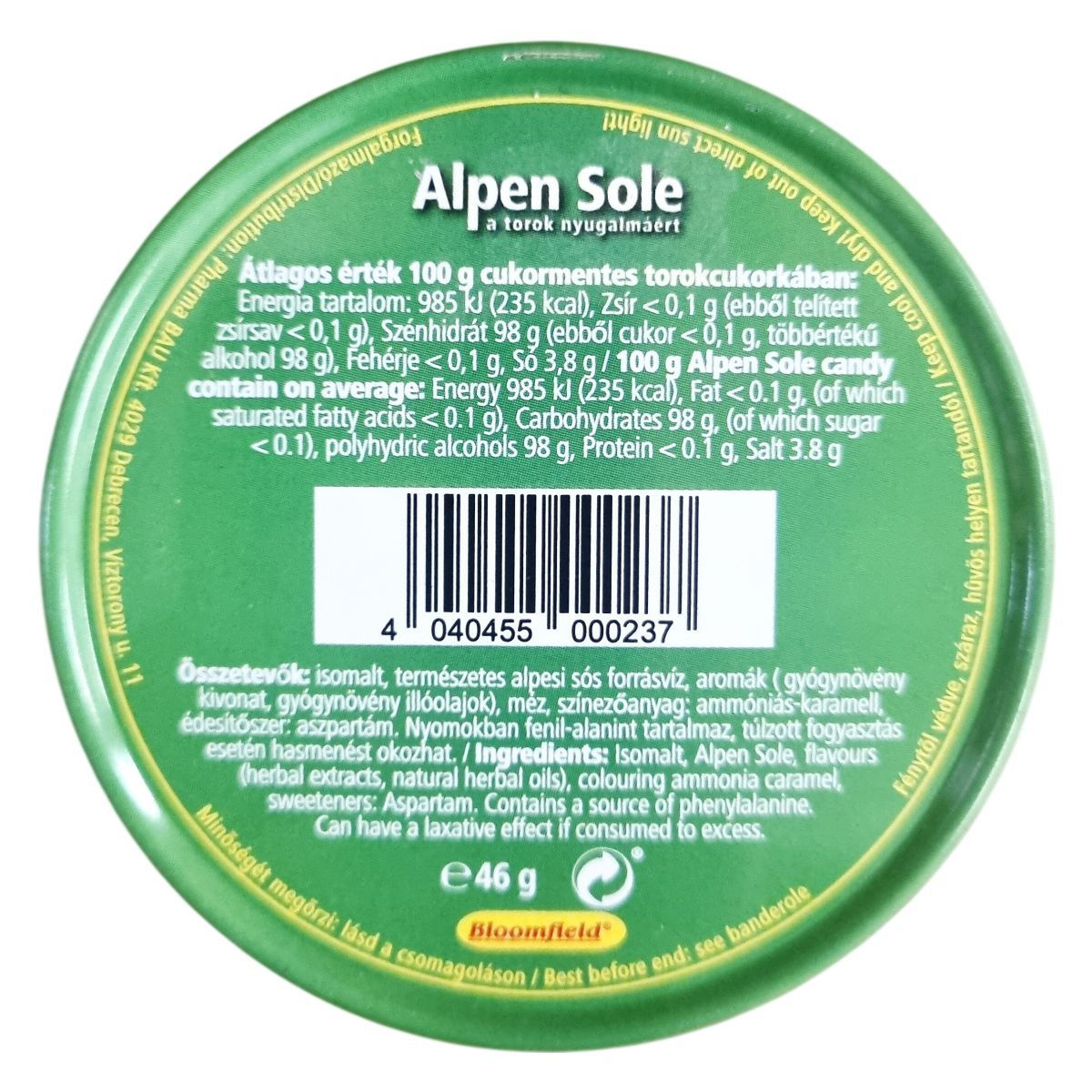 Az Alpen Sole cukormentes torokcukorka elsősorban a torok nyugalmának elősegítésére készült, természetes alpesi sós forrásvíz és gyógynövények felhasználásával. A termék aromái gyógynövény-kivonatokból és illóolajokból származnak, a kellemes ízélményt méz gazdagítja. A termék színezőanyagként ammóniás-karamellt tartalmaz, édesítőszere az aszpartám. Nyomokban fenil-alanint tartalmaz, ezért a terméket fogyasztók erre érzékenyeknek figyelmesnek kell lenniük. A cukor teljes mértékben helyettesítve van isomalttal és többértékű alkohollal, amelyek hozzájárulnak a cukormentességhez. A túlzott mértékű fogyasztása hashajtó hatású lehet. A termék energiatartalma 100 g-onként 985 kJ vagy 235 kcal, nagyon alacsony zsírtartalommal és minimális cukortartalommal rendelkezik. Csomagolását célszerű fénytől védett, száraz és hűvös helyen tárolni a minőség megőrzése érdekében.