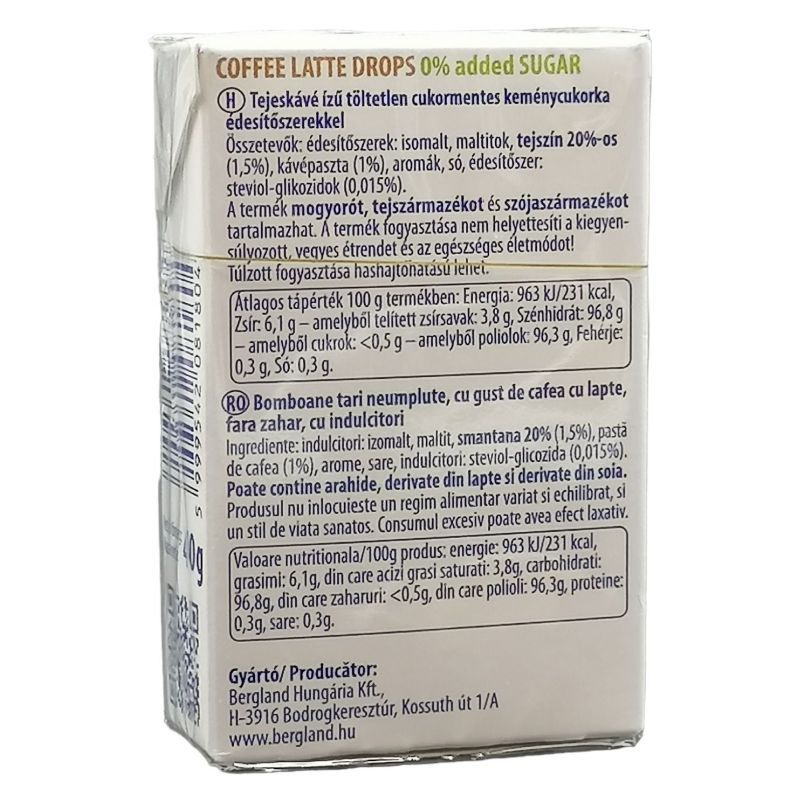 Tejeskávé ízű töltetlen cukormentes keménycukorka édesítőszerekkel.