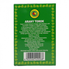 Próbálja ki a legjobb minőségű, a népi gyógyászatban használt mézet, mentolt, eukaliptuszt, ánizs olajat és szerzetesek körtéjét tartalmazó aranyat érő szopogató tablettát. Alkalmazási javaslat: napi 6 szem. Összetevők: méz, mentol, eukaliptusz olaj, szerzetesek körtéje gyümölcs, mandarin, ánizs olaj, nádcukor. Tartalom: 12 darab. Nettó tömeg: 24 g. Alkalmazási javaslat: 1 tabletta alkalmanként, de naponta maximum 6 tabletta. Tárolási mód: Száraz, hűvös helyen. Származási hely: Kína.