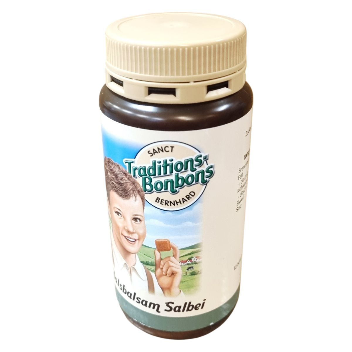A SANCT Traditions-Bonbons BERNHARD Halsbalsam Salbei egy zsályával készült torokcukorka, amely cukrot és glükózszirupot tartalmaz. A termék kivonatot és olajat tartalmaz a zsályalevelekből, és Németországban készül. Nettó tömege 170 g. A tárolást hűvös, száraz helyen, 25 °C alatt javasolt végezni.