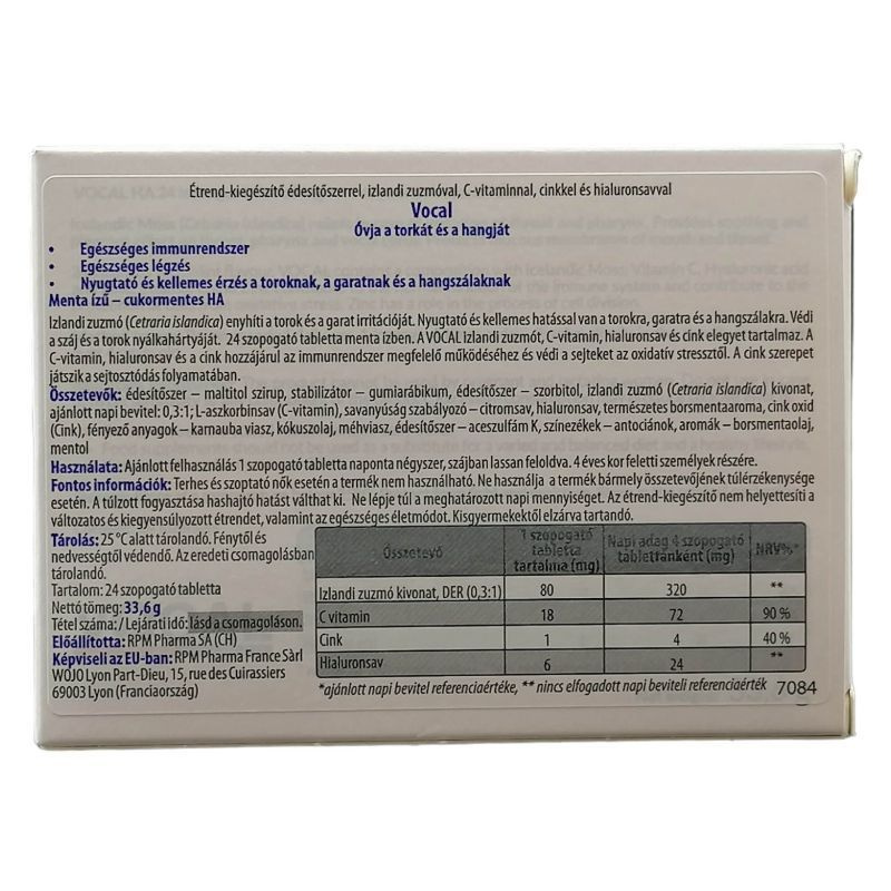Nyugtató és kellemes hatással van a torokra, garatra és a hangszálakra. Védi a száj és a torok nyálkahártyáját. A C-vitamin, hialuronsav és a cink hozzájárul az immunrendszer megfelelő működéséhez és védi a sejteket az oxidatív stressztől. A Vocal HA szopogató tabletta menta ízben izlandi zuzmót, C-vitamin, hialuronsav és cink elegyet tartalmaz.