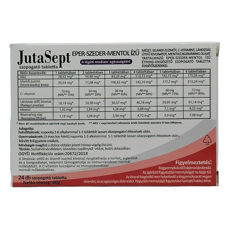 Mézet, izlandi zuzmót, C-vitamint, lándzsás útifű kivonatot, mentolt és rozmaring olajat tartalmazó étrend-kiegészítő szopogató tabletta édesítőszerekkel.