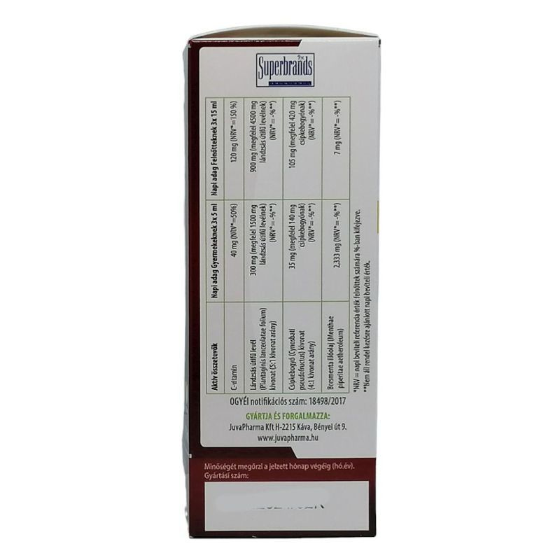 Alkoholt nem tartalmaz. Figyelmeztetés: Kisgyermekek elől elzárva tartandó! Azz ajánlott napi fogyasztási mennyiséget ne lépje túl! Az étrend-kiegészítő nem helyettesíti a kiegyensúlyozott vegyes étrendet, és az egészséges életmódot. Cukorbetegeknek, várandós és szoptatós kismamáknak, valamint pajzsmirigy elégtelenségben szenvedőknek a készítmény fogyasztása nem ajánlott. Adagolás: Felnőtteknek 3x15 ml, Gyermekeknek 3x5 ml.