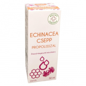 A BÁLINT Echinacea csepp propolisszal egy olyan étrend-kiegészítő, amely bibor kasvirág, méz, kakukkfű, citromfű és propolisz vizes alkoholos kivonatát tartalmazza. A propolisz és az echinacea hozzájárulhat az immunrendszer működéséhez. A termék fogyasztása előtt fel kell rázni, és az esetlegesen megjelenő üledék nem befolyásolja a termék minőségét. A napi adag 45 cseppben megtalálható a fent felsorolt hatóanyagok mennyisége. A terméket szobahőmérsékleten, felbontás után fénytől védett hűvös helyen kell tárolni, és gyermekek elől elzárva tartandó. A termék Magyarországon készül, és a Herbárium 2000 Kft. gyártja és forgalmazza.