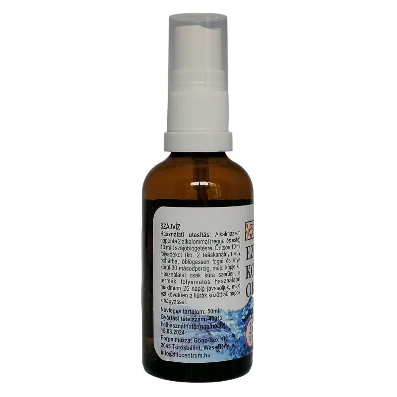 A spray oldat 25 ppm koncentrációban tartalmaz kolloidális ezüstöt, praktikus pumpás kiszerelésben. Szájvízként alkalmazva segíthet a szájüreg tisztán tartásában, friss érzetet adhat, miközben egyszerű, kímélő összetétellel rendelkezik.