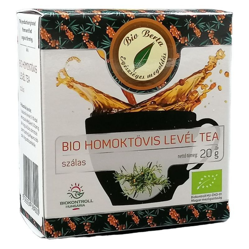Összetevők: natúr szálas tea bio homoktövis levélből*. *Ellenőrzött ökológiai gazdálkodásból származó termék. Ellenőrizte: Biokontroll Hungária Nonprofit Kft. HU-ÖKO-01