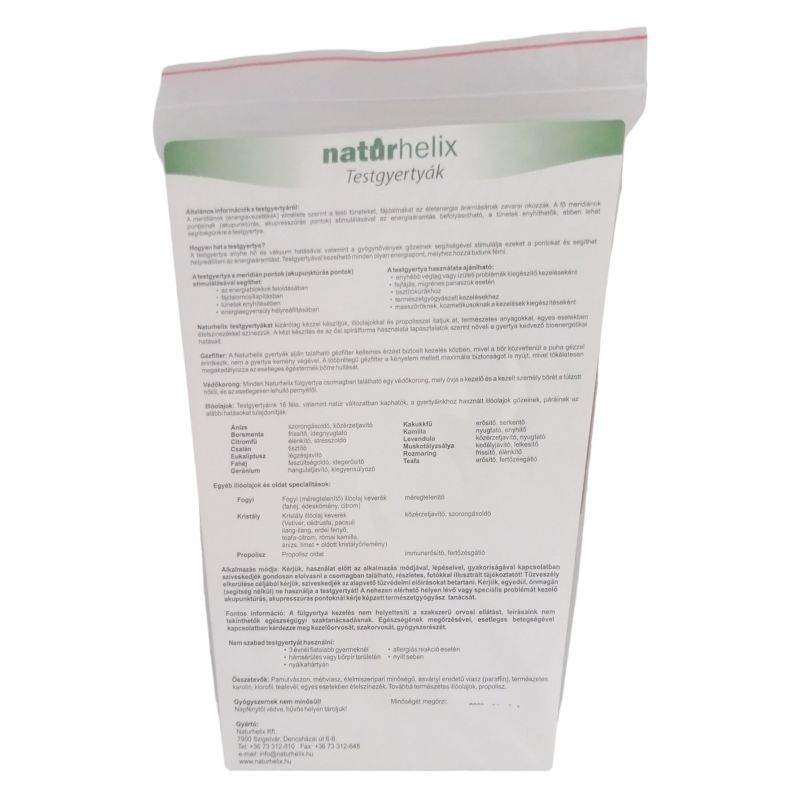 A gyertya hatását rövid megelőző masszírozással, enyhe nyomással fokozhatjuk. Nehezen elérhető helyen lévő vagy speciális problémát kezelő pontoknál kérje képzett természetgyógyász tanácsát. A testgyertya ajánlható általánosságban: enyhébb végtag vagy ízületi problémák kiegészítő kezeléseként, fejfájás, migrénes panaszok esetén, tisztítókúrákhoz, természetgyógyászati kezelésekhez.