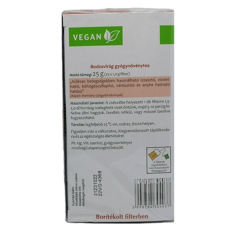 Hűléses betegségekben használható izzasztó, vizelethajtó, köhögéscsillapító, vértisztító és enyhe hashajtó hatású - (Rápóti-Romváry: Gyógyító növények). Használati javaslat: A csészébe helyezett 1 db filtertasakra 1,5-2,0 dl forró vizet öntünk, majd 5-10 percig lefedve állni hagyjuk. Ízesítés nélkül vagy mézzel ízesítve fogyasszuk! Tárolás: legfeljebb 25°C-on, száraz, tiszta helyen.