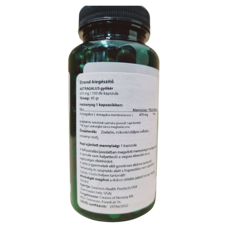 Az Astragalus gyökér kapszula a Swanson Health Products gyártásában készült, és a Creams of Norway Kft. forgalmazza Magyarországon. A termék 470 mg Astragalus gyökér kivonatot tartalmaz kapszulánként, amely hozzájárulhat az immunrendszer támogatásához. A kapszulák zselatinból és mikrokristályos cellulózból készülnek. A termék használata során fontos, hogy ne lépjük túl az ajánlott napi mennyiséget, és tartsuk távol gyermekektől. Terhesség és szoptatás alatt nem ajánlott a fogyasztása. Tárolása száraz, hűvös helyen javasolt. Az OGYÉI notifikációs száma 29766/2022.