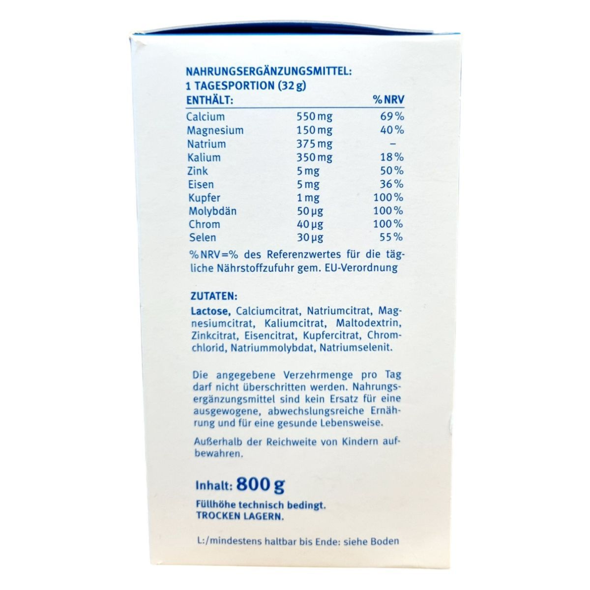 Laktóz, kalcium-citrát, nátrium-citrát, magnézium-citrát, kálium-citrát, maltodextrin, cink-citrát, vas-citrát, réz-citrát, króm-klorid, nátrium-molibdát, nátrium-szelenit.