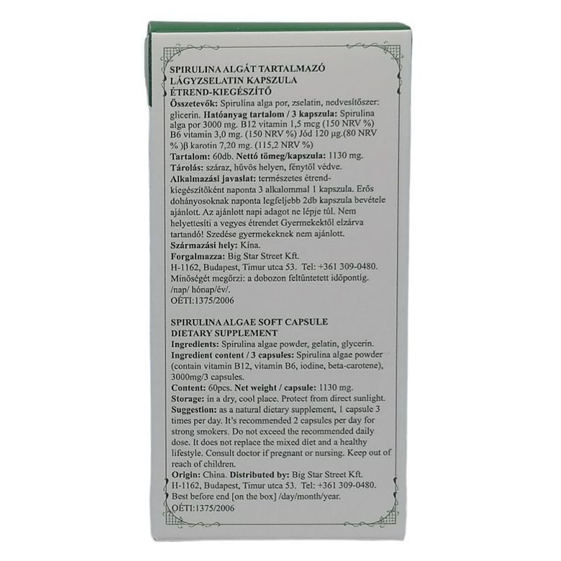 Szinte az összes vitamin és több mint 40 féle ásványi anyag megtalálható benne. Rendkívül fehérje gazdag, több aminosavat tartalmaz, melyet szervezetünk nem tud előállítani. Nagy mennyiségű vitamin és fehérje tartalma miatt nagyon népszerű a sportolók között. A Zöld Alga lágyzselatin kapszula erős méregtelenítő hatással bír, növeli az energiaszintet, elősegíti a testsúlycsökkentést. Alkalmazási javaslat: Napi háromszor egy Zöld Alga lágyzselatin kapszula szedése javasolt, erős dohányosok napi háromszor két darabra növeljék a mennyiséget. Összetétel: Spirulina alga por, glicerin. Tárolás: Száraz, hűvös helyen.