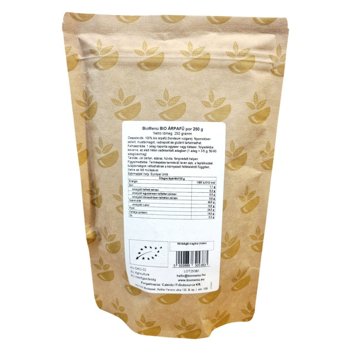 A BioMenü BIO Árpafű por egy 250 grammos kiszerelésű, 100% tisztaságú, organikus és nyers árpafűből készült étrend-kiegészítő. Az árpafű gazdag rostokban és fehérjében, így hozzájárulhat az egészséges táplálkozáshoz. A termék nyomokban tartalmazhat zellert, mustármagot, vadrepceét és glutént. Az ajánlott napi adag 3-5 gramm, amelyet folyadékba keverve lehet fogyasztani. A termék táplálkozási tulajdonságai változhatnak a környezeti feltételektől függően. Tárolása száraz, hűvös, fényvédett helyen javasolt. Az árpafű por az Európai Unióból származik, és a Caleido IT-Outsource Kft. forgalmazza.