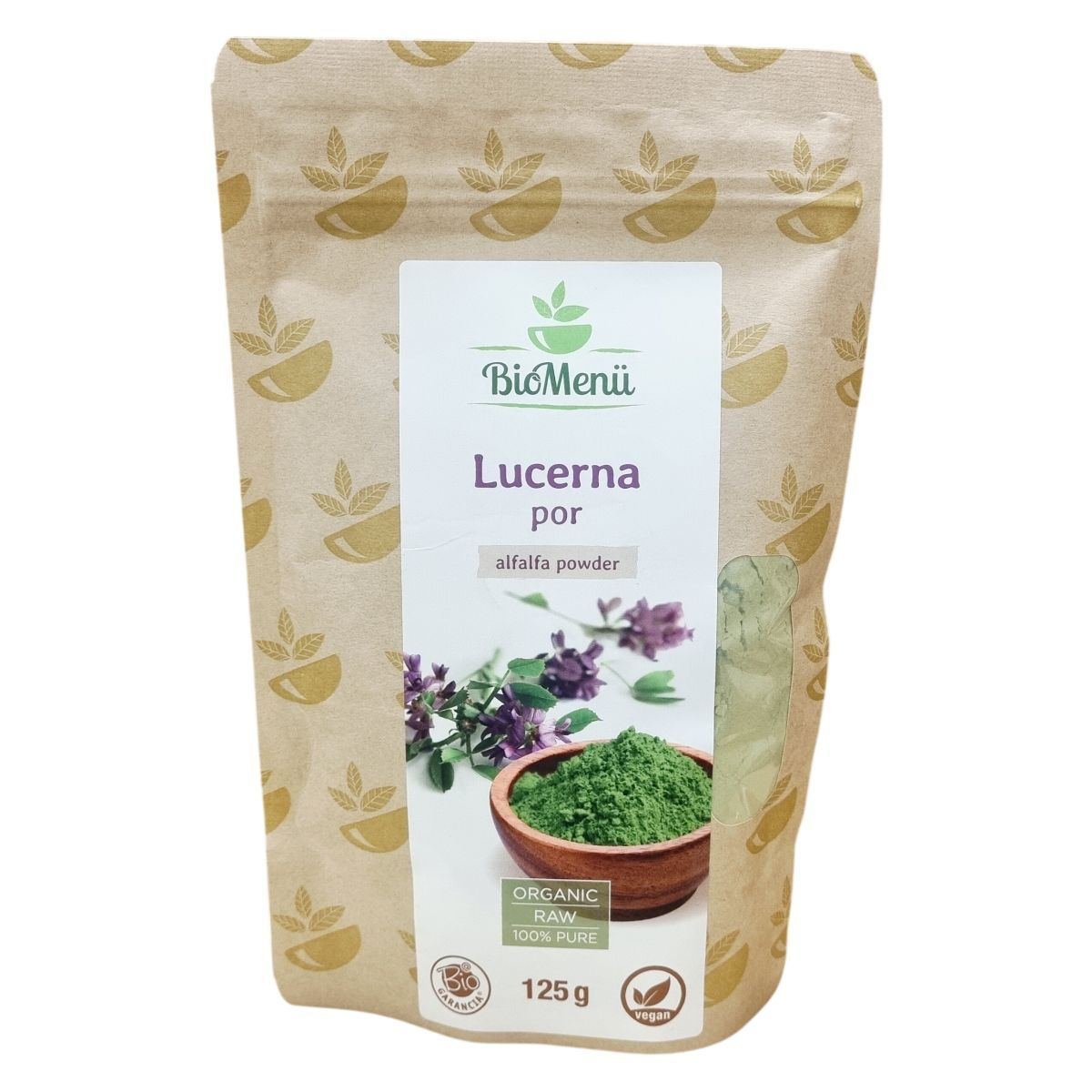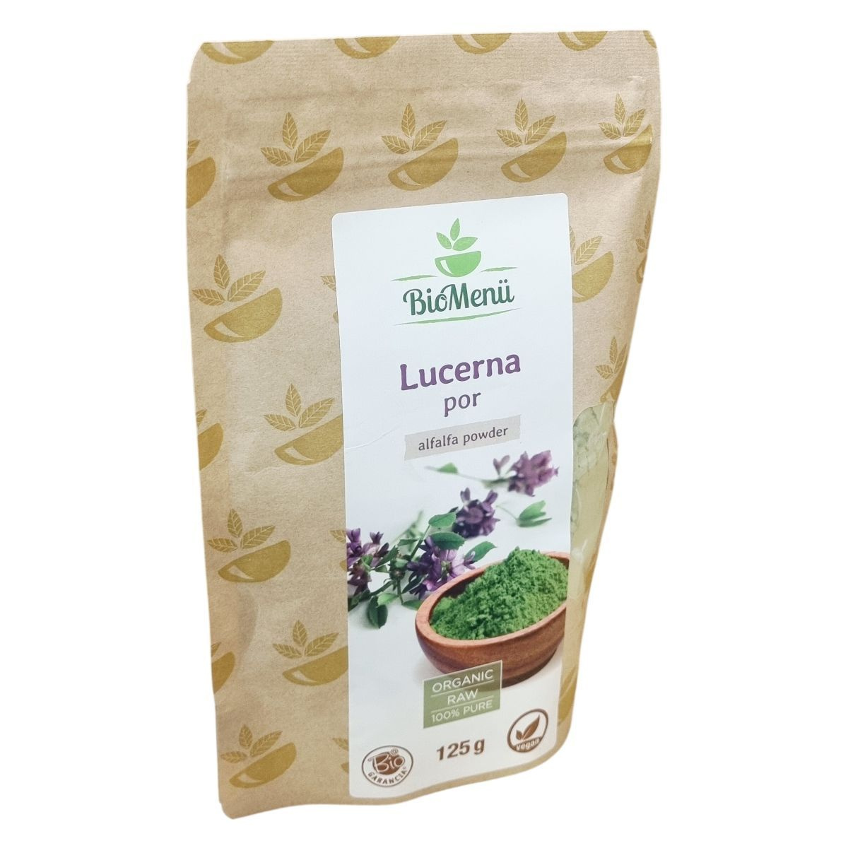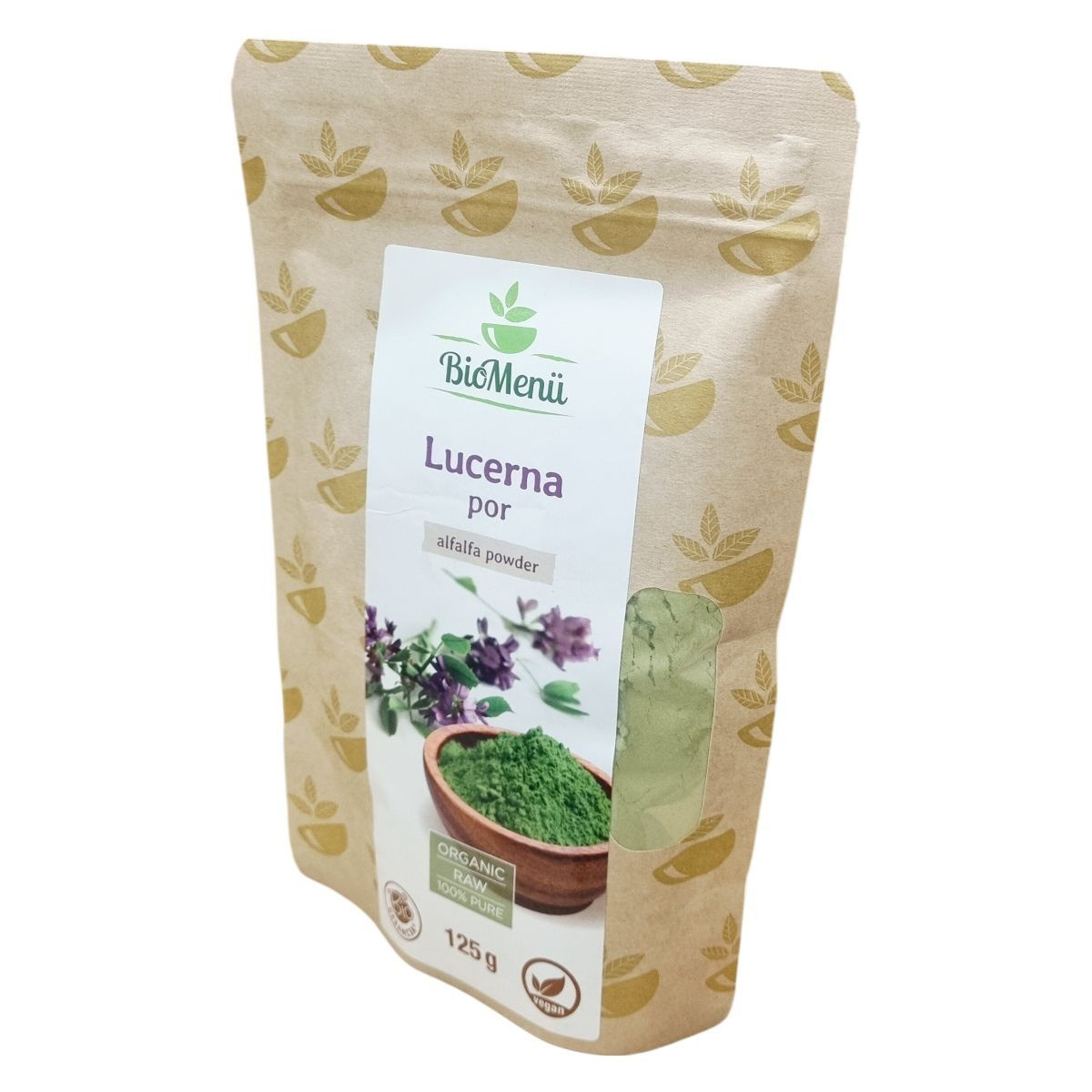 A BioMenü BIO Lucerna por készül 100% bio minőségű lucerna növényből (Medicago sativa), amely Európai Unióban termesztett alapanyagból áll. A termék natúr, vegán és nyers feldolgozású, így megőrzi a növény természetes összetevőit. Használható különféle ételek és italok kiegészítéseként, emellett kivonat készíthető belőle alkoholos oldószerrel. A csomagolás 125 grammos kiszerelésű, biztosítja a termék frissességét és megakadályozza a fény károsító hatását. A termék megfelel a bio minősítés szigorú feltételeinek, biztosítva a megbízhatóságot és minőséget. Az árusító vállalat Budapesten található. A termék fogyasztása előtt figyelembe kell venni a speciális egészségügyi figyelmeztetéseket, különösen, ha valaki fényérzékeny vagy transzplantációban részesült.