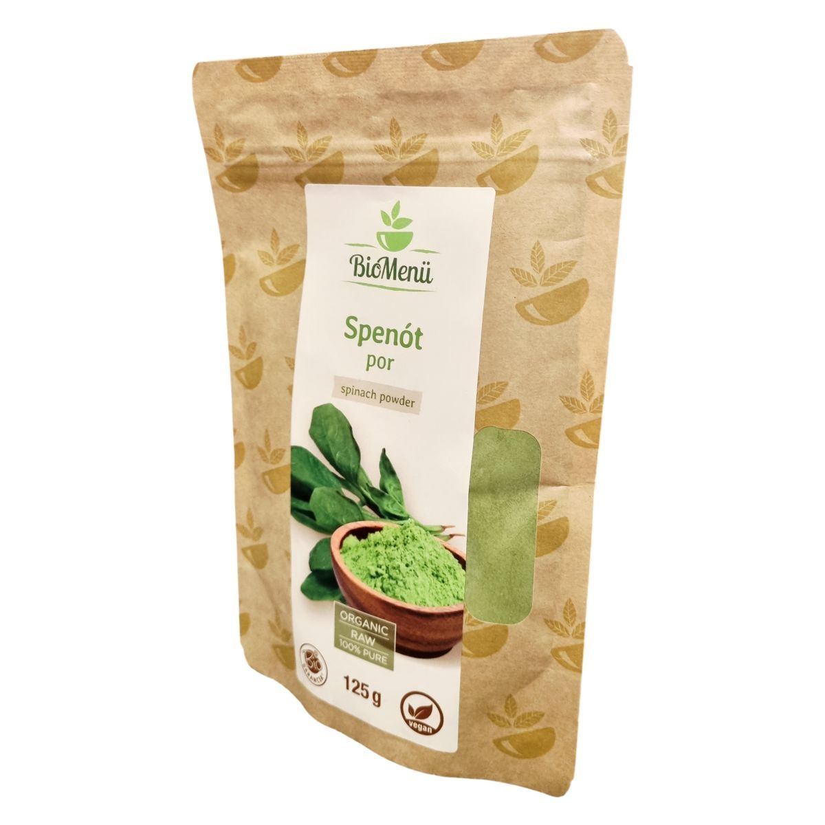 A BioMenü BIO SPENÓT por egy 100% tiszta, organikus és vegán termék, amelyet az Európai Unióban állítanak elő. A termék 125 grammos kiszerelésben kapható, és 25 adagot tartalmaz. A spenótpor gazdag fehérjében és rostban, ami hozzájárulhat az egészséges táplálkozáshoz. Az oxálsav tartalom miatt azonban nem ajánlott vese- és epehólyag problémákkal küzdőknek. A termék minőségét a HU-ÖKO-02 tanúsítvány garantálja.