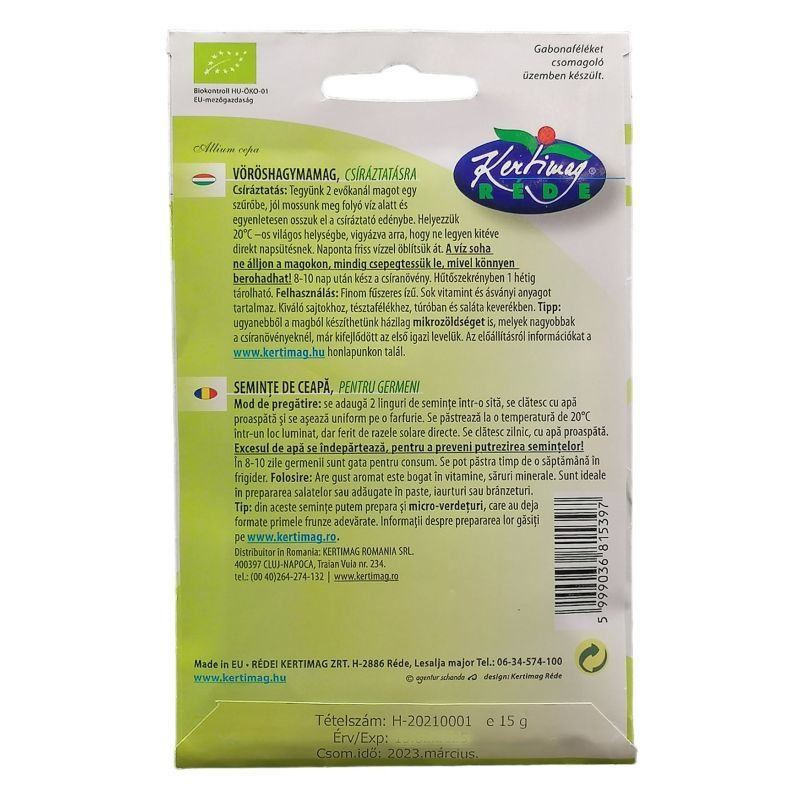 A vöröshagymamag csíráztatásra alkalmas, bio minőségű, erőteljes ízű hajtásokat nevel egészséges ételekhez.