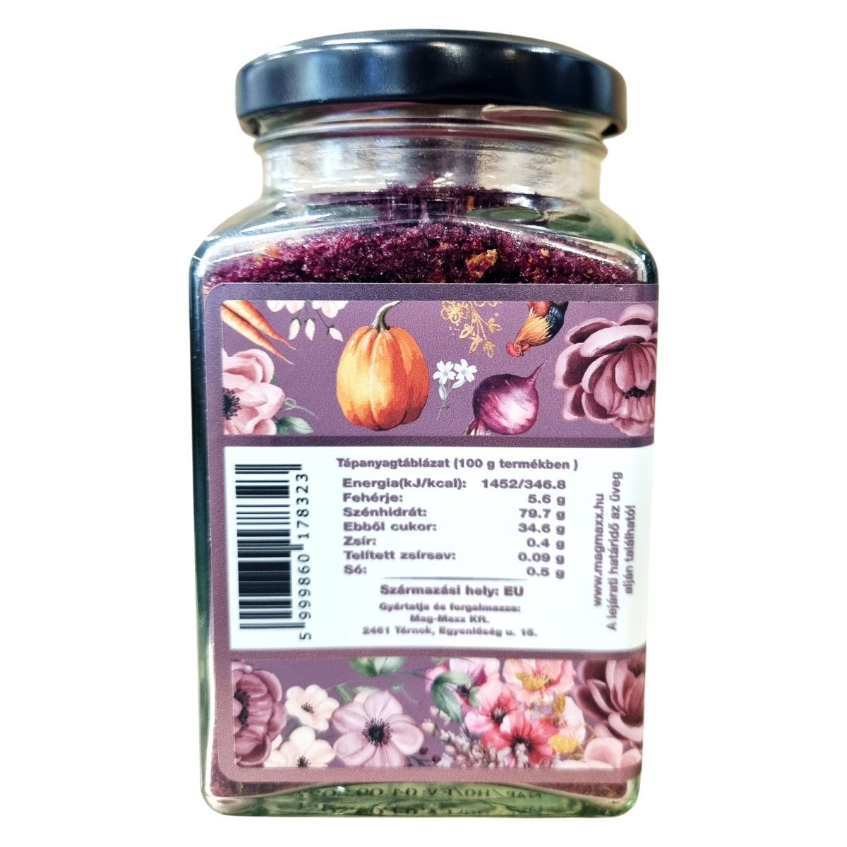 70% cékla, 15% sárgarépa, 5% sütőtök, 10% csomósodásgátló anyag (GMO mentes kukoricakeményítő)