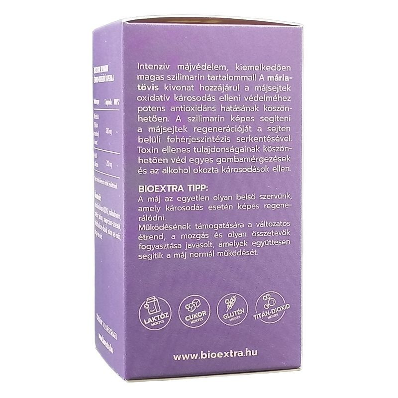 Hatóanyaga, a szilimarin védi a májat a toxikus anyagokkal szemben, lassítja a májkárosodást és gyorsítja a szövetek regenerációját. Alkalmazható gyógyszeres terápia kiegészítésére, támogatja a méregtelenítő kúra eredményességét. A Bioextra Silymarin kapszula a Májbetegekért Alapítvány ajánlásával rendelkezik és a lehető legmagasabb szilimarin tartalmú étrend-kiegészítő készítmény. Összetevők: máriatövis kivonat, maltodextrin, zselatin, térfogatnövelő (kukoricakeményítő), poliszorbát 80, csomósodás gátló (megnézium-sztearát), színezék (vörös vas-oxid, titán-dioxid). Hatóanyag a napi adagban: 280 mg máriatövis kivonat, ebből 210 mg szilimarin/ 1 kapszula. Notifikációs szám: 7781/2010.