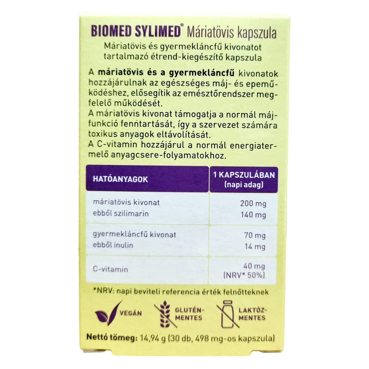 A biomed® SYLIMED® Máriatövis kapszula egy vegán, glutén- és laktózmentes étrend-kiegészítő, amely máriatövis és gyermekláncfű kivonatot tartalmaz. A termék célja, hogy támogassa a máj és az epe egészséges működését, valamint elősegítse az emésztőrendszer megfelelő működését. A C-vitamin tartalma hozzájárulhat a normál energiatermelő anyagcsere-folyamatokhoz. A kapszulák 30 darabos kiszerelésben kaphatók, és napi egy kapszula fogyasztása javasolt, lehetőleg főétkezés után, bő folyadékkal. A terméket száraz helyen, 10-25 °C között kell tárolni, és fontos, hogy kisgyermekek elől elzárva tartsuk.