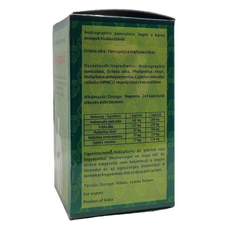 Fontos! Súlyos májműködési zavarok és epeutak elzáródása esetén, illetve terhes anyák és 3 éves kor alatti gyermekek számára szedése nem ajánlott! Összetétel 1 kapszulában (500 mg-ban): Hatóanyagok 1 kapszula: Hollarhena antidysenterica 111 mg, Cyperus rotundus: 111 mg, Aloe barbadensis: 111 mg, Andographis paniculata: 111 mg, Boerhaavia diffusa: 57 mg. Kiszerelés: 60 db-os kiszerelés Adagolás: Naponta 2x1 kapszula étkezés után, vízzel bevenni. Kúraszerű használata ajánlott! Figyelmeztetés! Gyermekek elől gondosan el kell zárni. A készítményt más gyógyszerekhez képest legalább egy óra eltéréssel célszerű bevenni. A tabletta az arra érzékeny személyeknél laza székletet eredményezhet, ilyen esetben az adag csökkentése javasolt. Alkalmazása során kerülni kell a nehéz, zsíros ételek és az alkohol fogyasztását. Amennyiben panaszai nem csökkennek, ill. nem szűnnek meg, keresse fel orvosát. Az étrend-kiegészítő nem helyettesíti a vegyes étrendet és az egészséges életmódot! Ajánlott napi adag 2 kapszula.