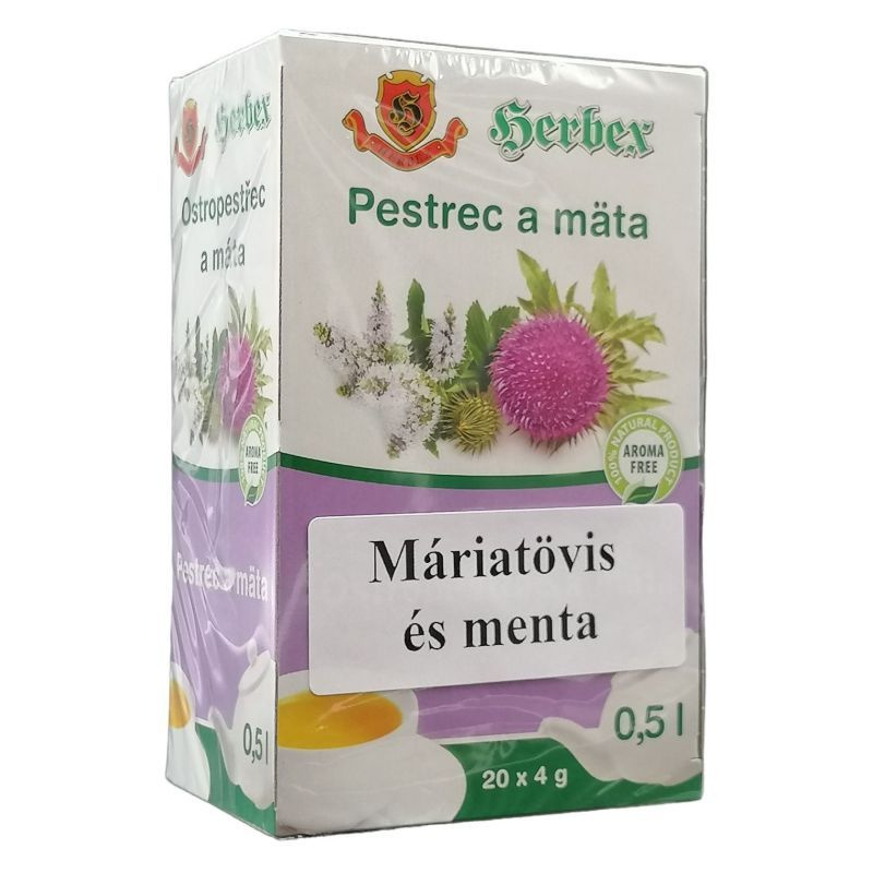Összetevők: máriatövis termés, borsmenta levél. Nettó tömeg: 80 g, 20 db 4 g-os filter tasak. Elkészítése: 1 db filter tasakot leforrázunk 0,5 l vízzel, majd 10 percig állni hagyjuk.
