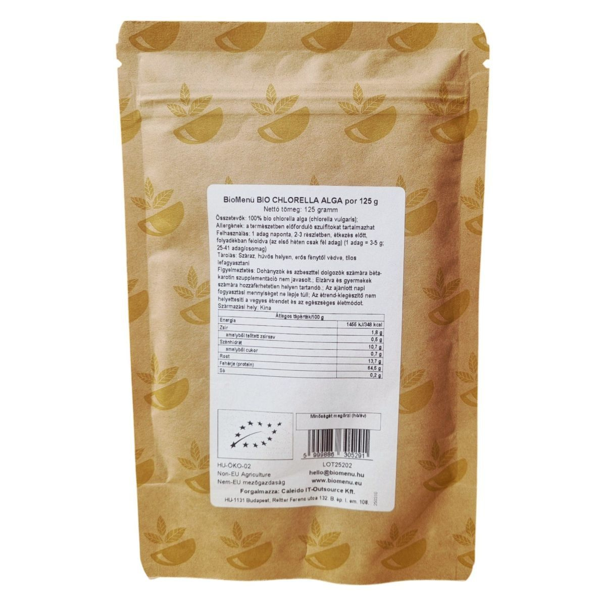 A BioMenü Chlorella algapor egy 100% bio, raw és vegán termék, amely Kínából származik. A chlorella alga gazdag fehérjében és rostban, így hozzájárulhat az egészséges táplálkozáshoz. A termék 125 grammos kiszerelésben kapható, és a csomagolás 25-41 adagot tartalmaz. A chlorella algát folyadékban feloldva ajánlott fogyasztani, étkezés előtt. A termék természetes szulfítokat tartalmaz, ezért allergiásoknak érdemes figyelniük erre. A termék minőségét a Bio GARANCIA biztosítja.