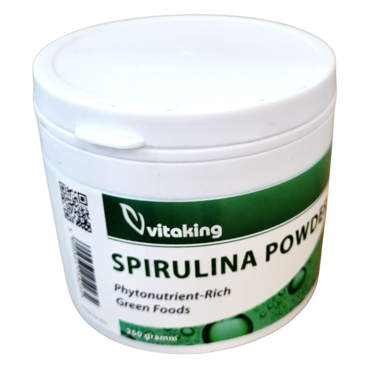 A Vitaking Spirulina Powder egy fitonutriensekben gazdag étrend-kiegészítő, amely 250 grammos kiszerelésben kapható. A termék fő összetevője a spirulina alga por, amely természetes forrása lehet a klorofilnak, polipeptideknek és karotinoidoknak. A termék napi ajánlott mennyisége 1 evőkanálnyi (7g), amelyet nem szabad túllépni. A termék nem helyettesíti a vegyes étrendet és az egészséges életmódot. Tárolása száraz, hűvös helyen javasolt, gyermekektől elzárva. Forgalmazza a Vitaking Kft., székhelye Veszprémben található.