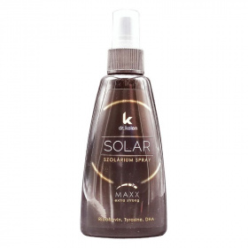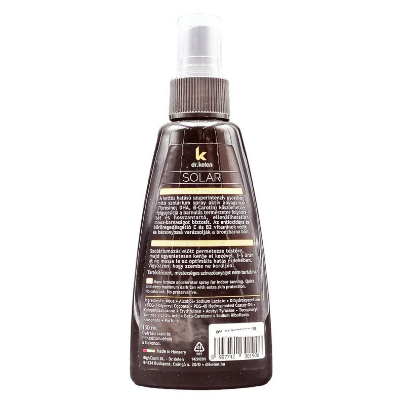 A kettős hatású szuperintenzív gyorsbarnító szolárium spray aktív anyagainak (Tyrosine, DHA, β-Carotin) köszönhetően felgyorsítja a barnulás természetes folyamatát és hosszantartó, ellenállhatatlan maxx-barnaságot biztosít. Az antioxidáns és bőröregedésgátló hatású E és B2 vitaminok védik és bársonyossá varázsolják a bronzbarna bőrt.