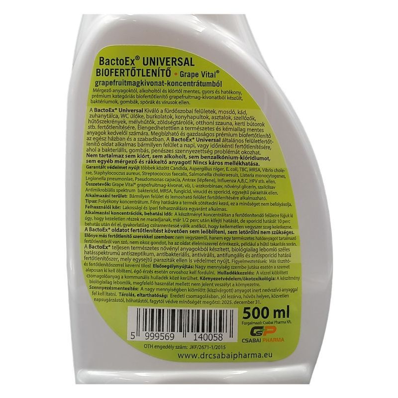 Kiváló a fürdőszobai felületek, mosdó, kád, zuhanyozó tálca, WC ülőke, burkolatok, konyhapultok, asztalok, szellőzők, hűtőszekrények, mélyhűtők, zöldségtárolók, kerti bútorok stb. fertőtlenítésére. Elengedhetetlen a természetes és kémiailag tiszta anyagok kedvelői számára. A levegőbe fújva az aerosol légfrissítésre és levegőfertőtlenítésre is alkalmas. A BactoEx® általános fertőtlenítő oldat alkalmas felületek napi, vagy időnkénti fertőtlenítésére. Garantált védelmet nyújt többek között Candida, Aspergillus niger, E. coli, TBC, MRSA, Vibrio cholerae, Staphylococcus aureus, Streptococcus faecalis, Salmonella choleraesuis, Listeria monocytogenes, Legionella pneumoniae, Pseudomonas capacia, Antrax (lépfene), Influenza A,B,C, HPV stb. ellen. Nem tartalmaz sem klórt, sem alkoholt, sem egyéb mérgező és rákkeltő anyagot! Nincs káros mellékhatása!